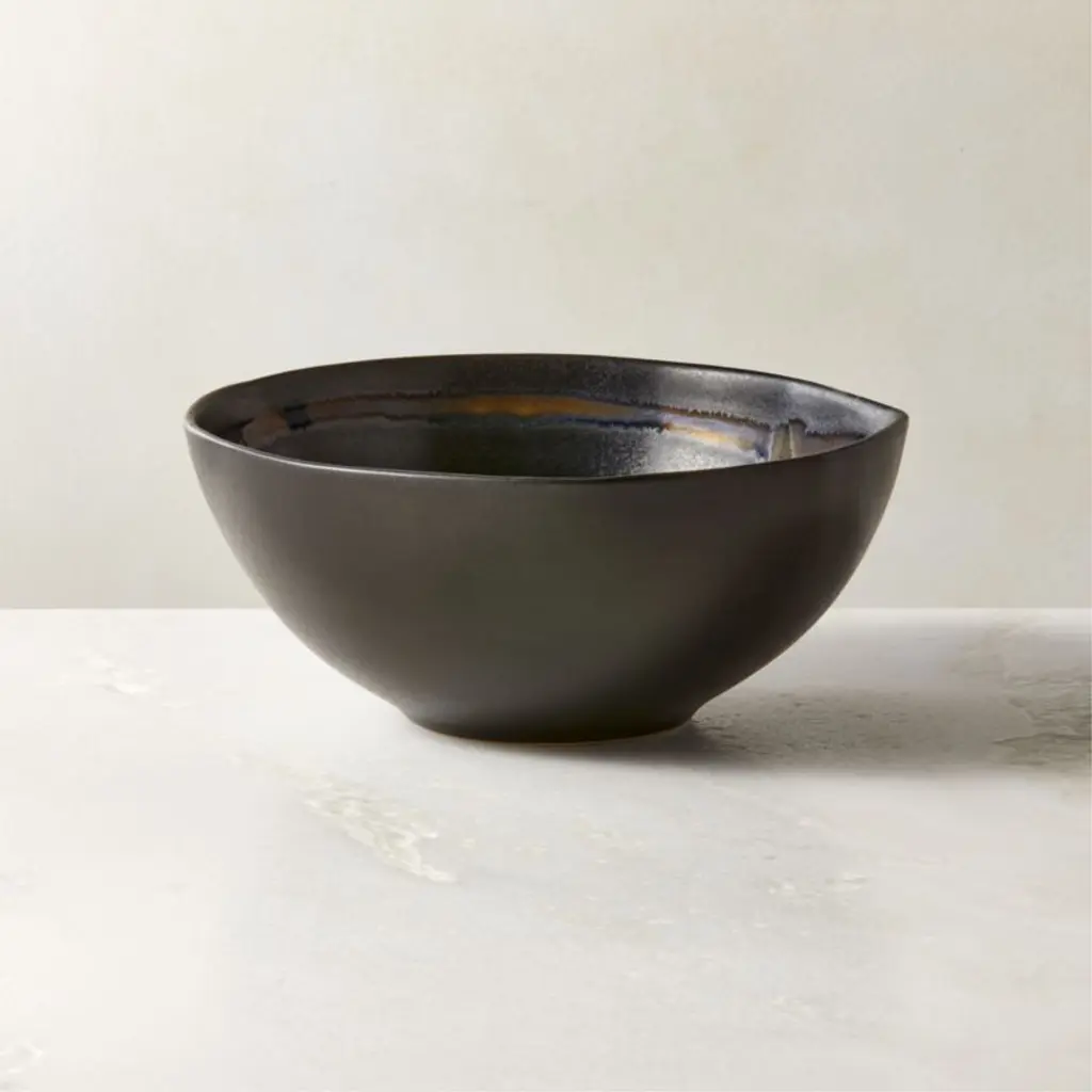 Striking black stoneware dinnerware is carefully shaped and finished by hand, then given a reactive glaze along its rim. An additional firing achieves a subtle yet eye-catching gloss that reveals understated tonal variations. Each handmade piece will have subtle differences that highlight the artisanal quality and creative process. Set includes a dinner plate, salad plate, soup bowl and mug. CB2 exclusive.