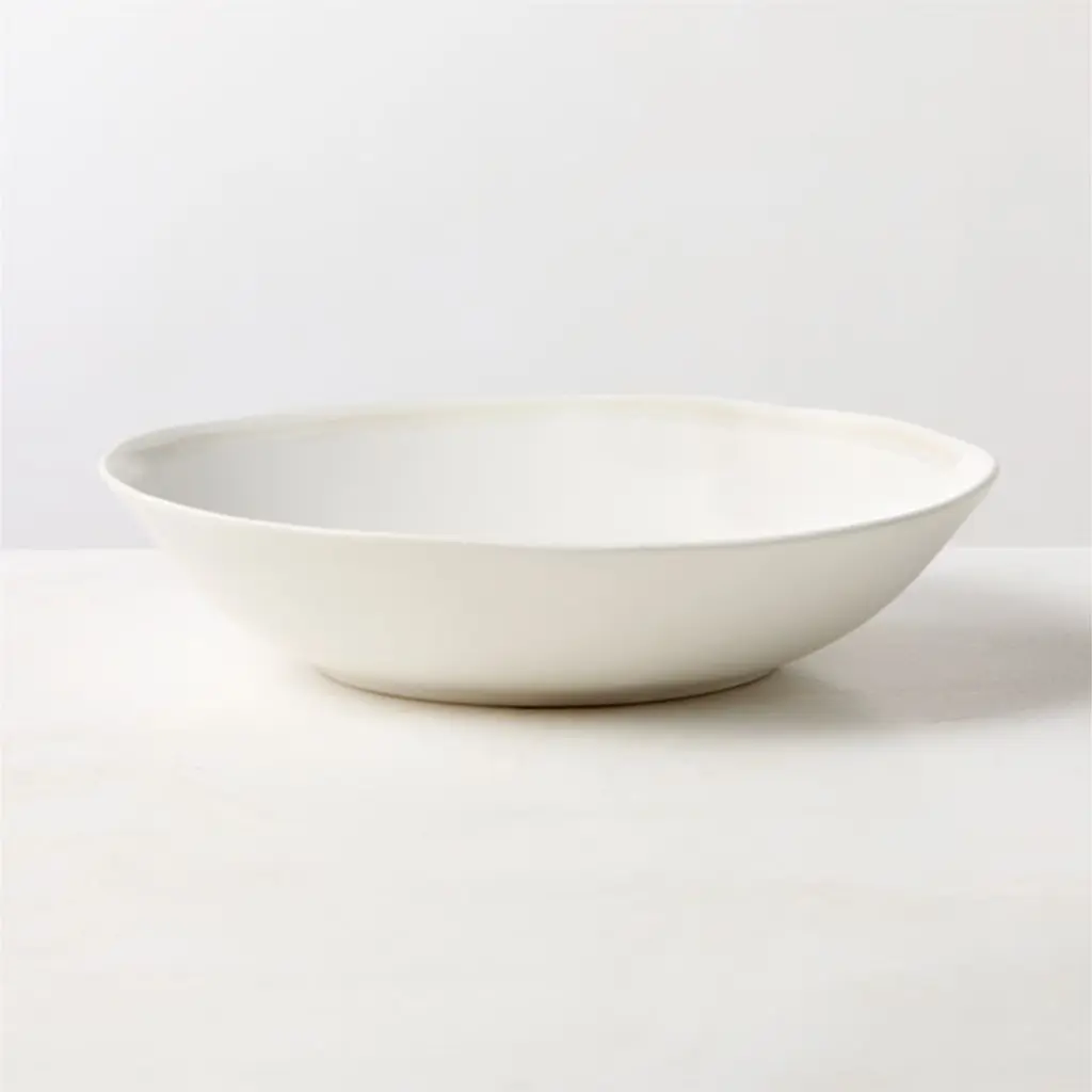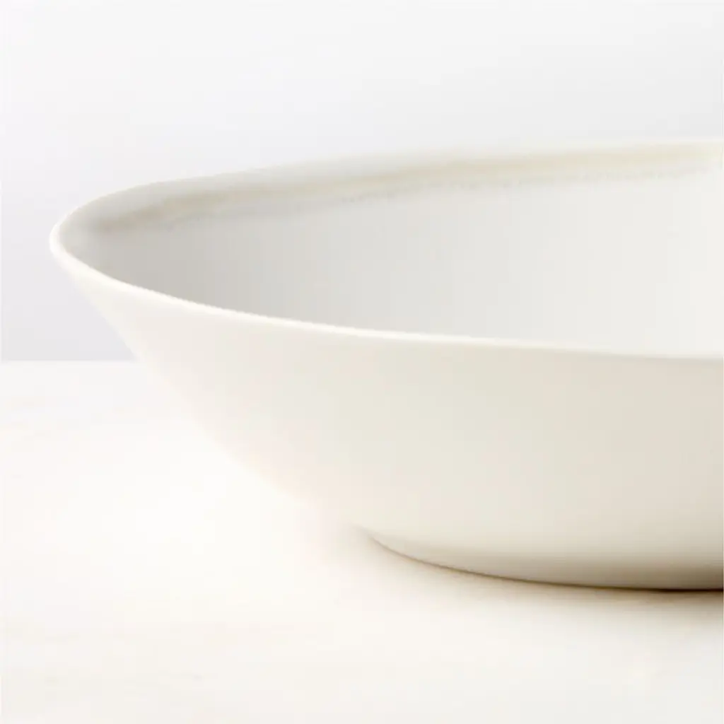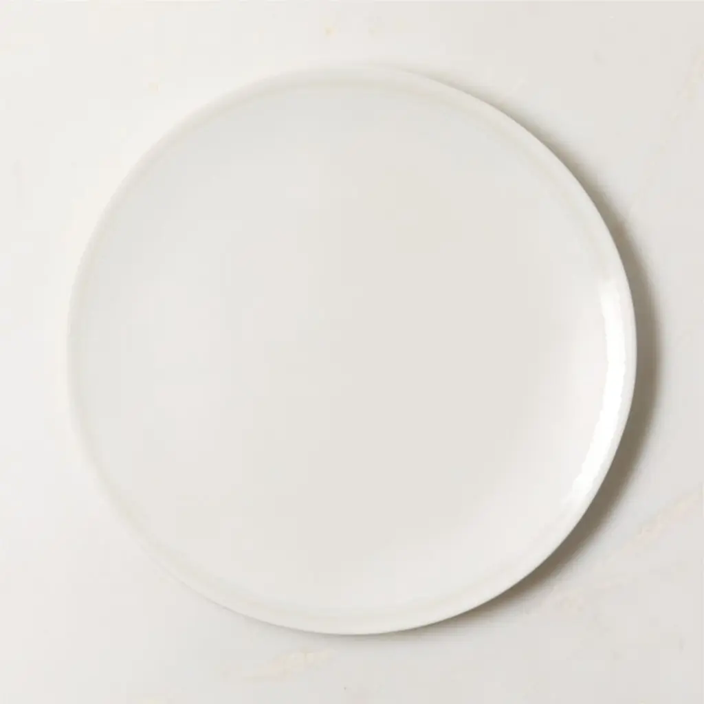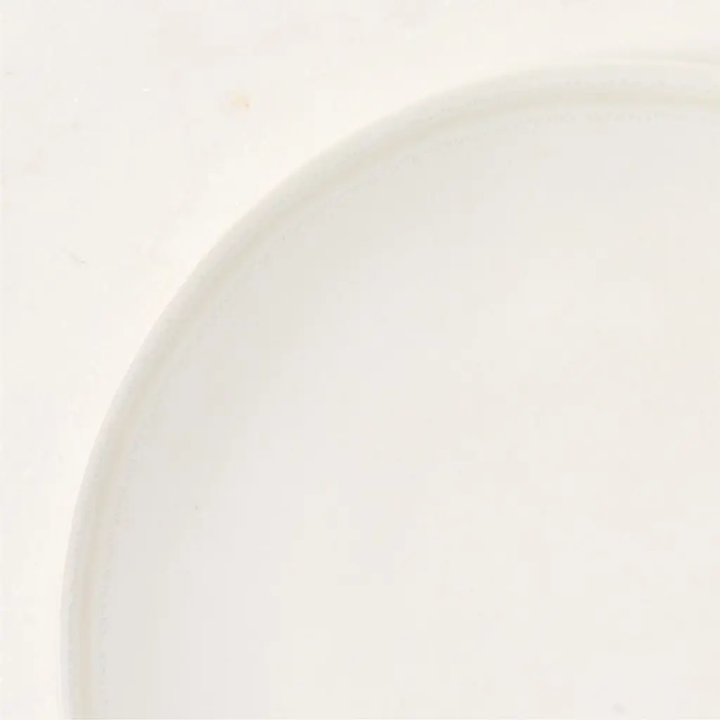 Crisp matte white dinnerware set is carefully shaped and finished by hand, then given a reactive glaze along each rim. An additional firing achieves a subtle yet eye-catching sheen that reveals understated ivory tonal variations. Each handmade piece will have subtle differences that highlight the artisanal quality and creative process. Set includes a dinner plate, salad plate, pasta bowl and mug. CB2 exclusive.