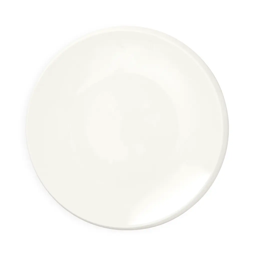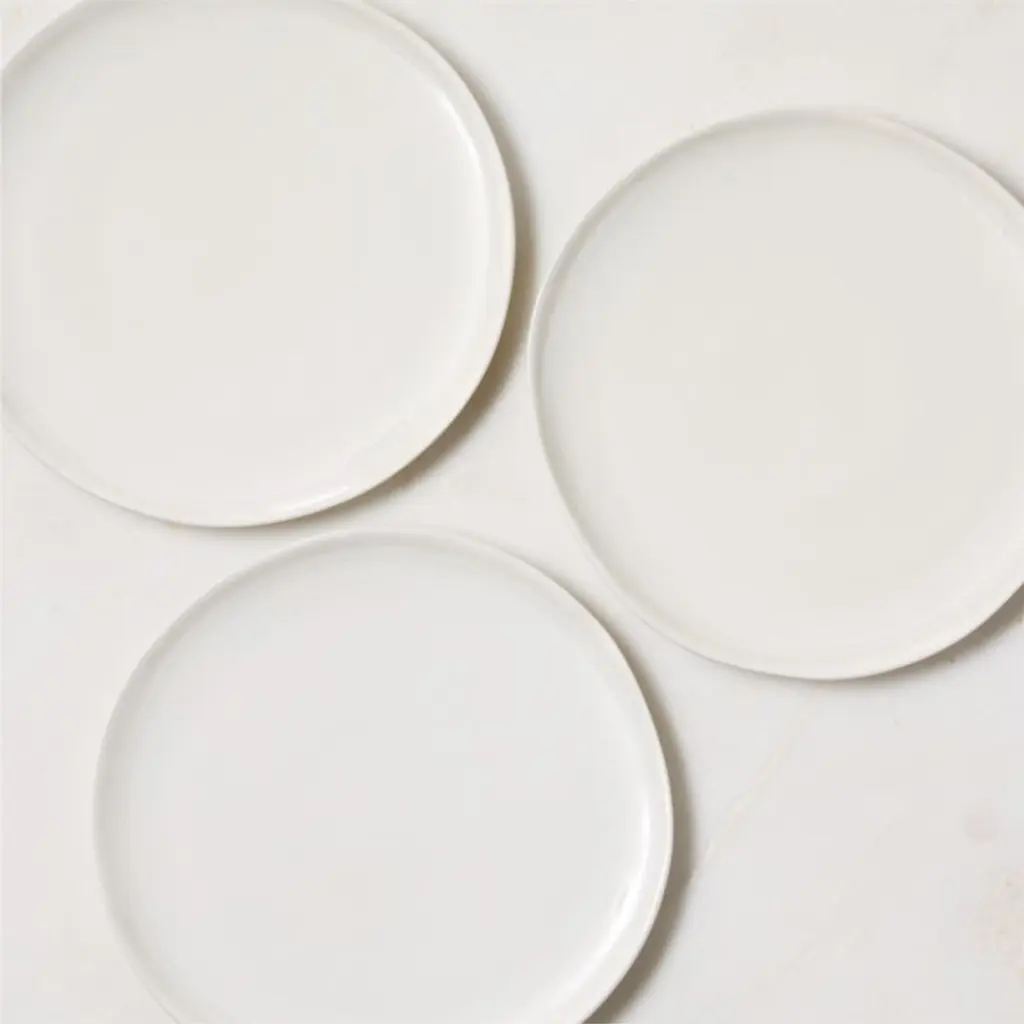 Crisp matte white salad plate is carefully shaped and finished by hand, then given a reactive glaze along its rim. An additional firing achieves a subtle yet eye-catching sheen that reveals understated ivory tonal variations. Each handmade piece will have subtle differences that highlight the artisanal quality and creative process. CB2 exclusive.