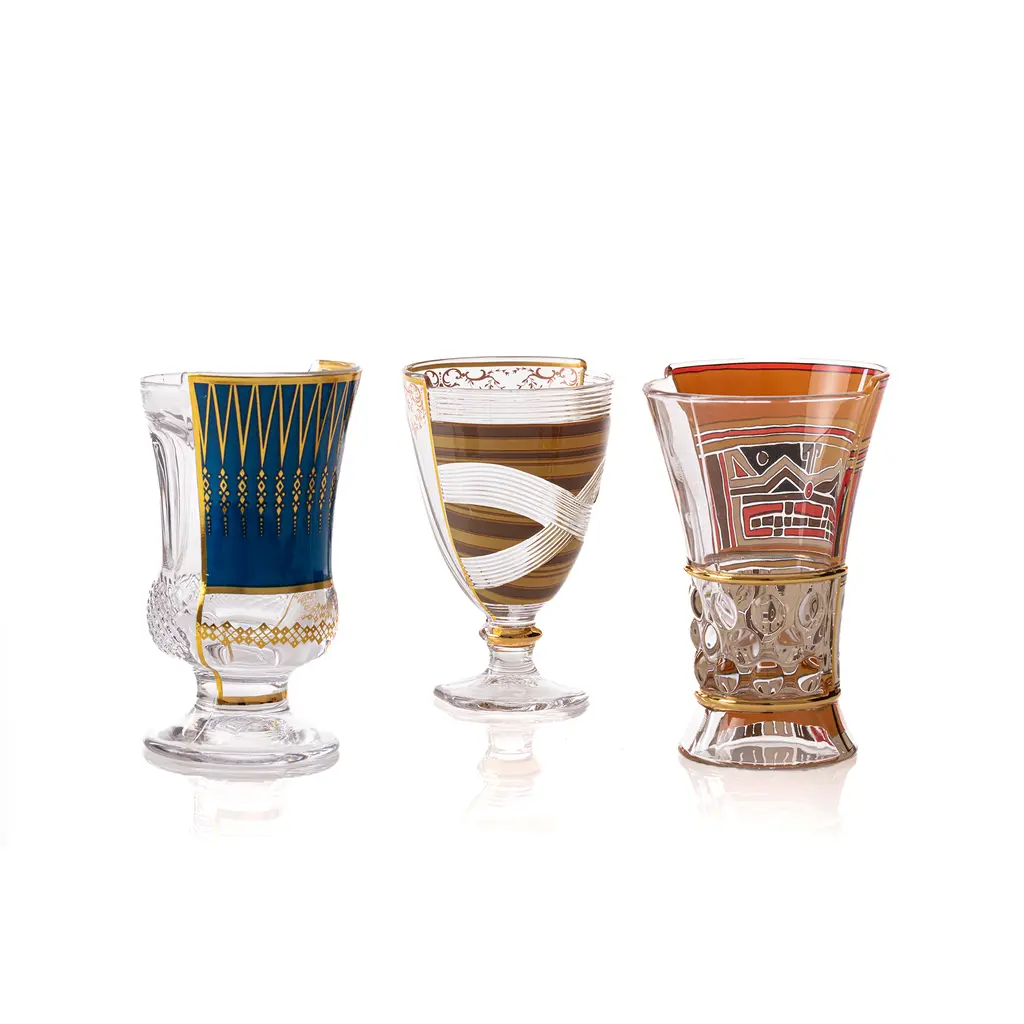 Serve cocktails in a set of unforgettable glasses with this collection from the Seletti Hybrid series. Created by design studio CTRLZAK, the Hybrid collection brings together Eastern and Western decorative patterns. The Pannotia glasses feature a “split” design with one half representing the Western glassware style and the other Eastern traditions. Made from pure glass, the set features bright colors and intricate details. Each set contains 3 different designs that take you on a journey through the world’s history of glassware decoration. The perfect gift for Italian design fans and art lovers.