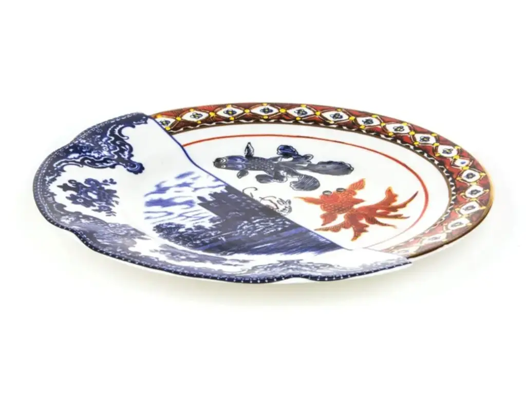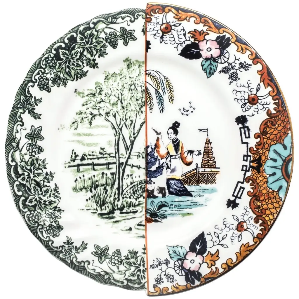 When east and west combine. A collection that reflects ancient historic Western and Eastern ceramic production. Hybrid decorations that come from a complex past that evolve into contemporary shapes.Dinner plateMaterial: Bone China porcelain