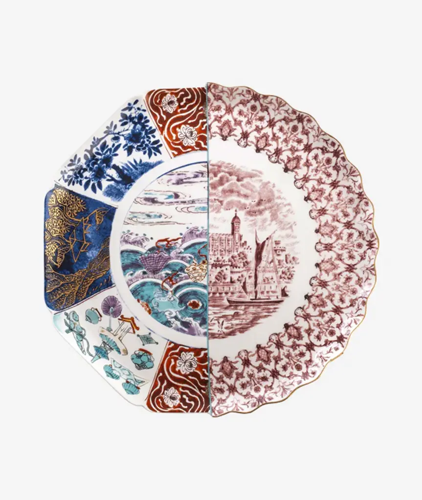 The split personality Hybrid dinnerware series fuses traditional Eastern and Western aesthetics in a playful but sophisticated way. Each piece of the collection melds two different china patterns – one from the East and one from the West – giving the impression that two separate plates, bowls, or cups have been joined together. To see the entire Hybrid dinnerware series, click here.