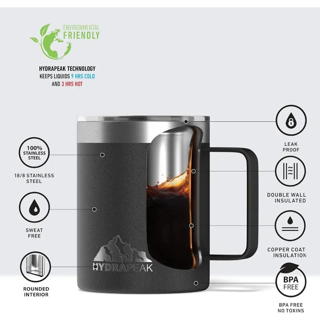 Hydrapeak's insulated mug keeps your beverage hot for 10x longer than ceramic or glass. By using Double Wall insulation, our coffee thermos keeps drinks cold for 9 hours, hot for 3 hours, and prevents condensation from forming