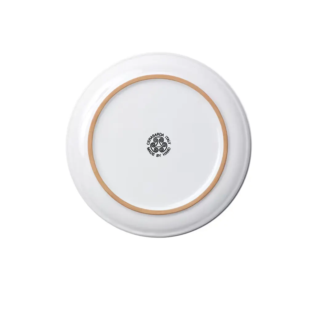 A stylized colorful image of a fish stands out on this white ceramic plate, symbolizing the marine life in Sardinia. Designed by Giorgio Bosi, the decoration is entirely handmade using the graffito method, whereby the terracotta surface is scratched to incorporate a vibrant selection of enamels.