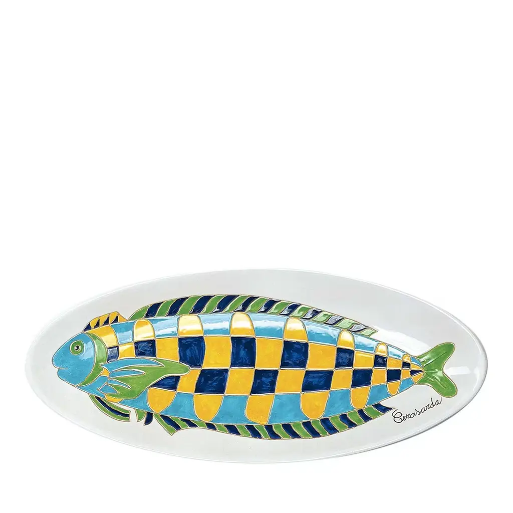 This one-of-a-kind plate designed by Giorgio Bosi is a splendid celebration of the Sardinian sea. Handcrafted of fine ceramic, it boasts a unique handmade decoration of a fish brimming with color and movement. The design is achieved using the graffito technique whereby the terracotta is scratched with enamels to create a singular objet d'art.\n