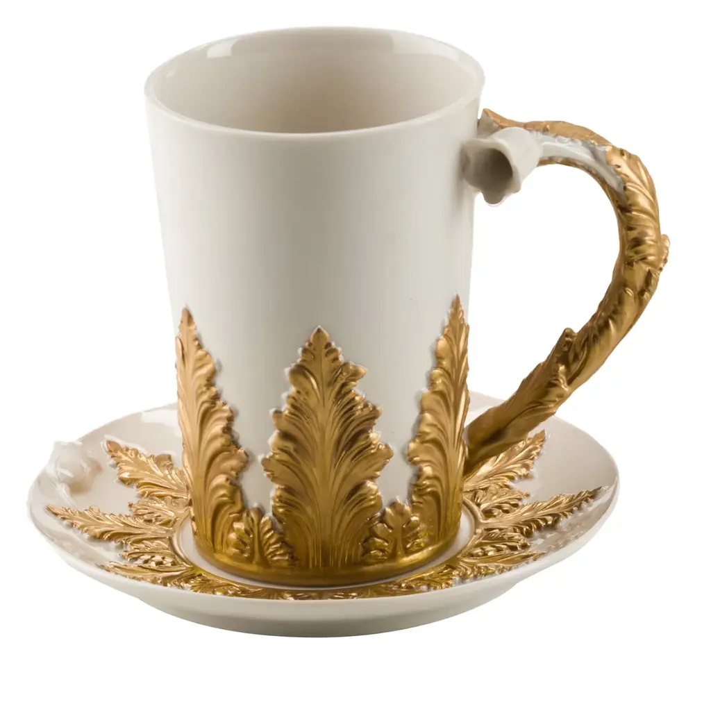 MugMaterial: Fine PorcelainMugs, tea and coffee sets with a baroque inspiration.Fine opaque porcelain with mat white finishing and fluorescent coloured handles.Brilliant and elegant, the new gold glossy finishing gives to the collection a new sophisticated way of living.
