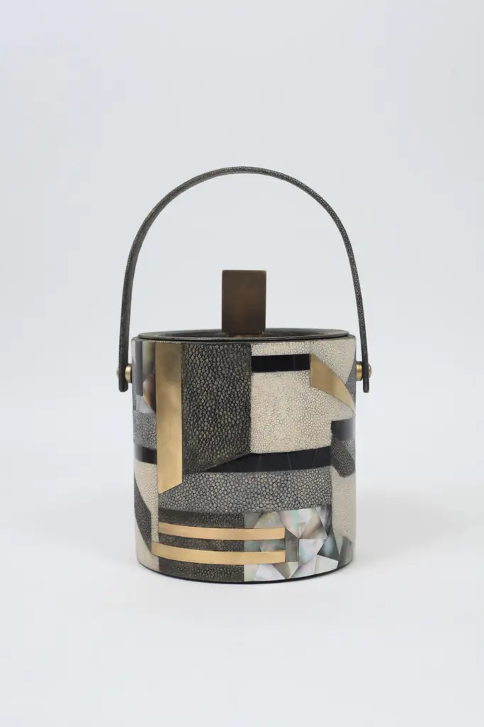 The Paris based label has distinguished themselves since their launch, with their iconic use of shagreen mixed with brass and other exotic materials. All furniture is handcrafted by skilled artisans, ultimately making each piece unique, designed in Paris and produced in the Philippines.The KIFU PARIS ice bucket is the ultimate luxury bar accessory, inlaid in a mixture of shagreen shell and brass to create a bold geometric pattern. This piece comes with an ice thong. Also available in plain shagreen and plain shell, see images at end of slide.The dimensions of this piece are approximately 15 diameter x 20 cmAll Kifu Paris pieces are handmade by artisans, ultimately making each piece unique.Custom color/sizing available on request.Wipe clean with soft dry cloth.Although inspired by her parents, her collection of Home Accessories and Furniture is a distinct identity of its own. Kifu uses handmade techniques of elaborate inlay patterns of shagreen, shells, semi-precious stones, materials she experienced as a child growing up in her parent’s studio, but interpreted in a younger quirkier way reflecting her youth. From her "jewelry inspired knobs" on decorative boxes, gold bar boxes and an extravagant inlay pattern mix of shagreen and shell inspired by galactic constellations, as seen on her enormous round mirror, is refreshing to see. Kifu embodies whimsical elements throughout her collection and is not afraid to be daring and unexpected in her approach to design. All shagreen-covered items should be kept out of direct sunlight, color variants may occur on the stingray and other exotic finishes, but this showcases the Parisian label's commitment to creating authentic luxurious products using natural components.