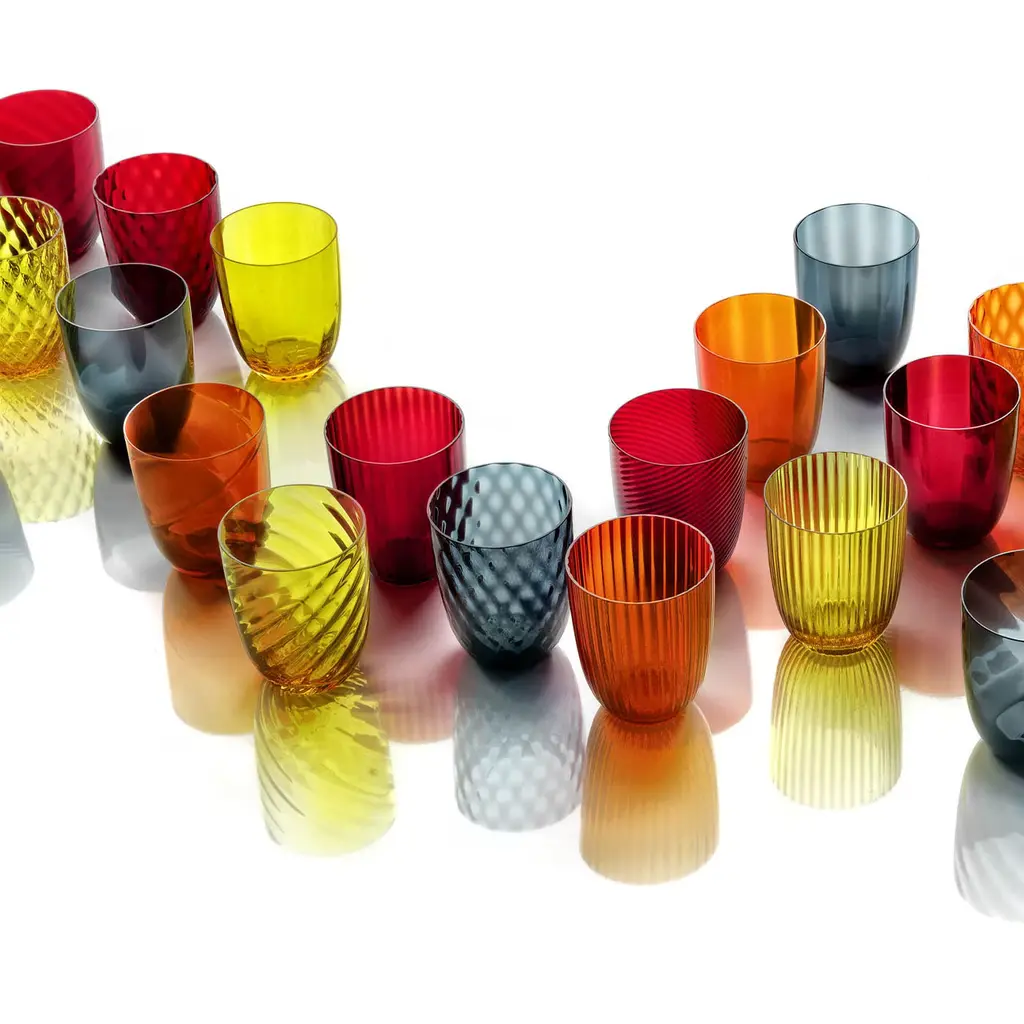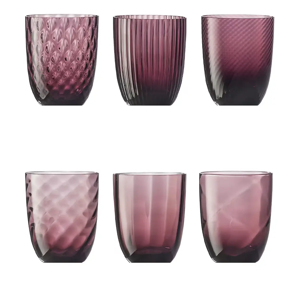 An array of elegant traditional Muranese textures - namely lente, ottico, ottico torsé, balloton, rigadin, and torsé - marks this precious Murano glass set of six water glasses. Masterfully mouth-blown and finished by hand, they are offered in a sophisticated shade of Air Force blue establishing a chromatic coherence that enhances their refined textural peculiarities.