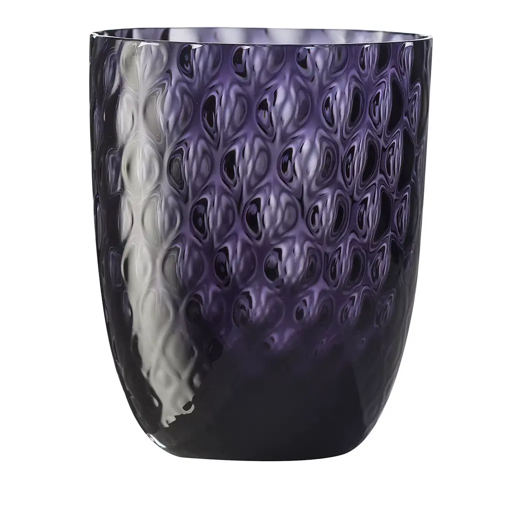 Part of the Idra Collection, this exclusive set of Murano glass comprises two water glasses rendered in an alluring tone of shaded plum. A pleasant, raised texture with a twisted design enriches the surface of the glass that gets etched by blowing it into a mold when still hot. A set of six glasses, as well as other color options for a lively combination, are available. Please consult the Concierge for availability and pricing.