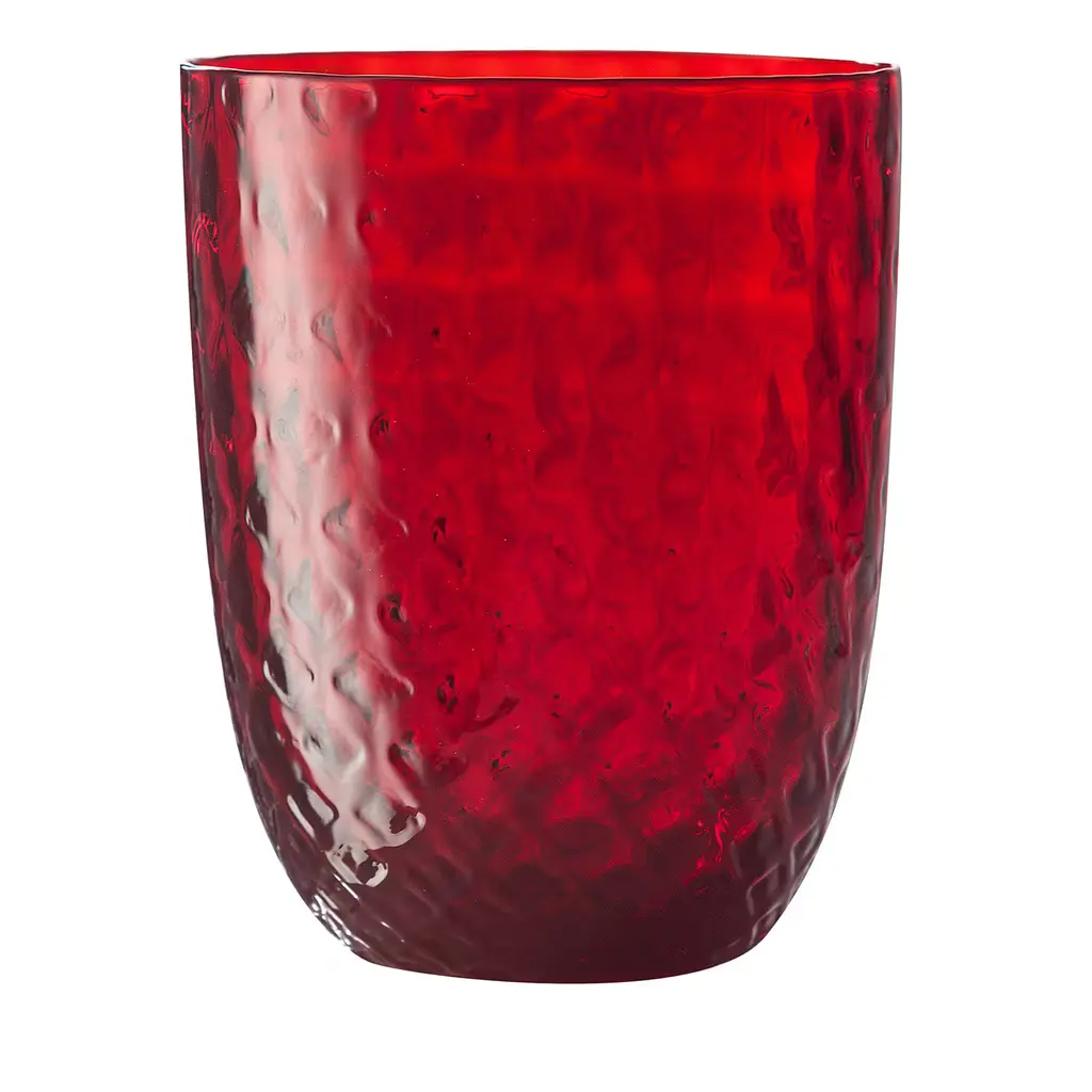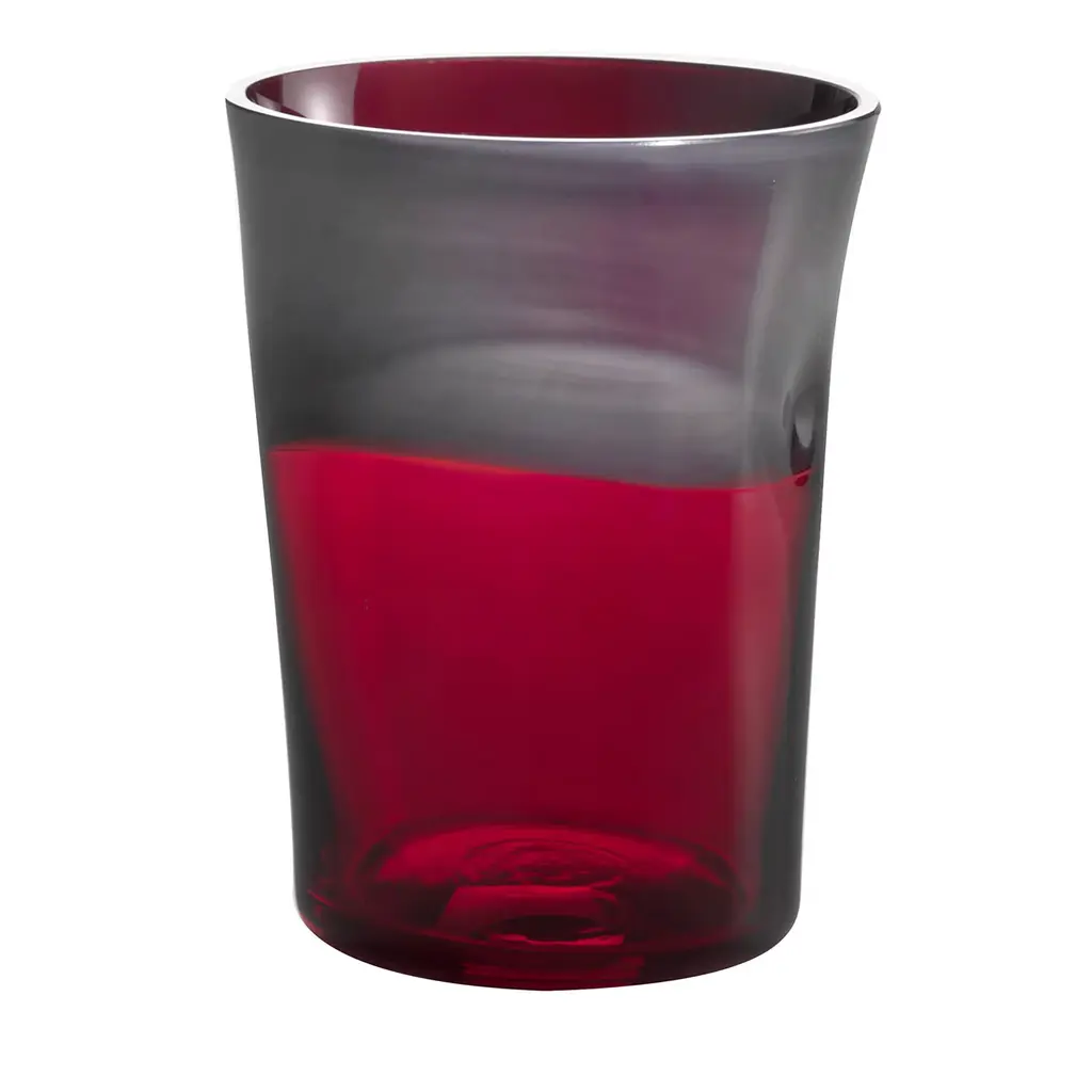 A simple silhouette crafted by master glassblowers in Murano, this glamorous set of two water glasses will accent any table with its enthralling design. The intense tone of red is enlivened by a captivating "lente" (lens) texture obtained by blowing hot glass into a specific mold. The set can be requested in its version of six pieces as well as in other color options, please contact the Concierge for details.