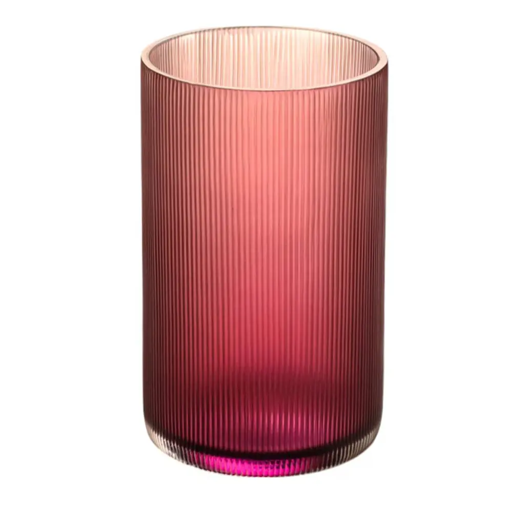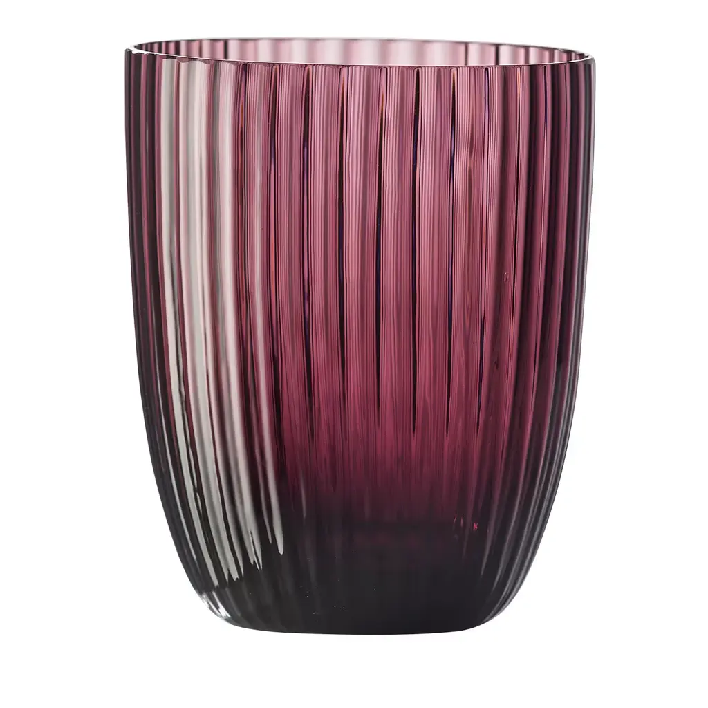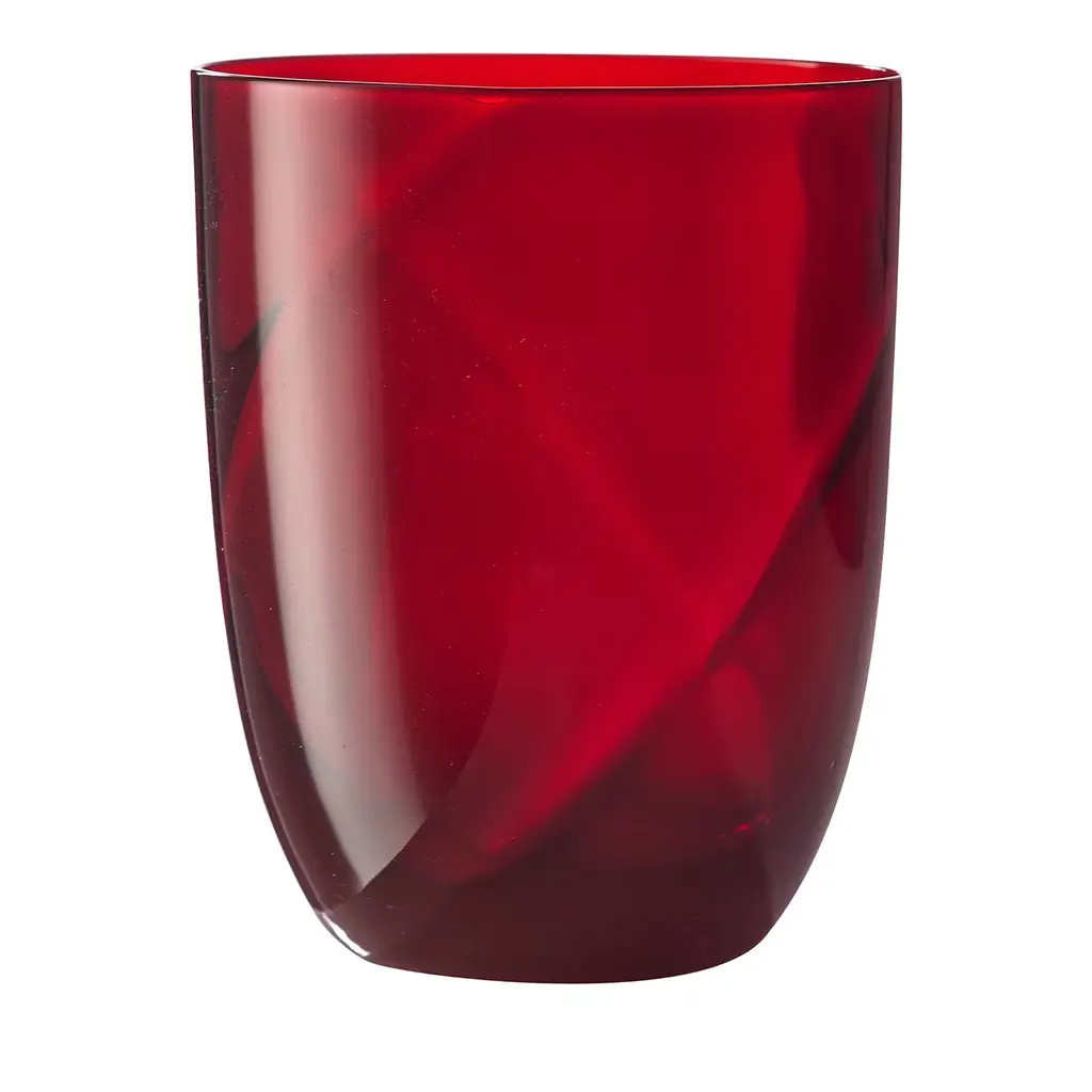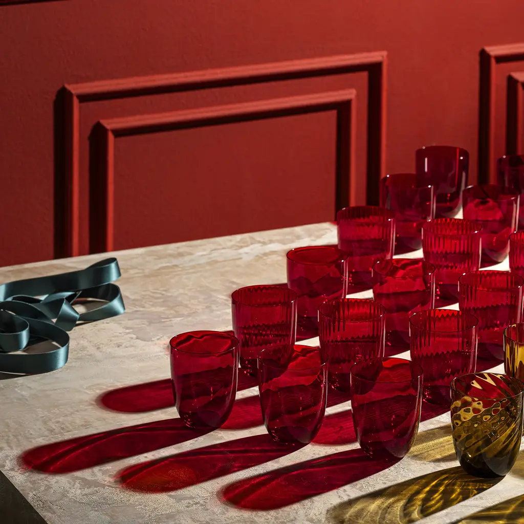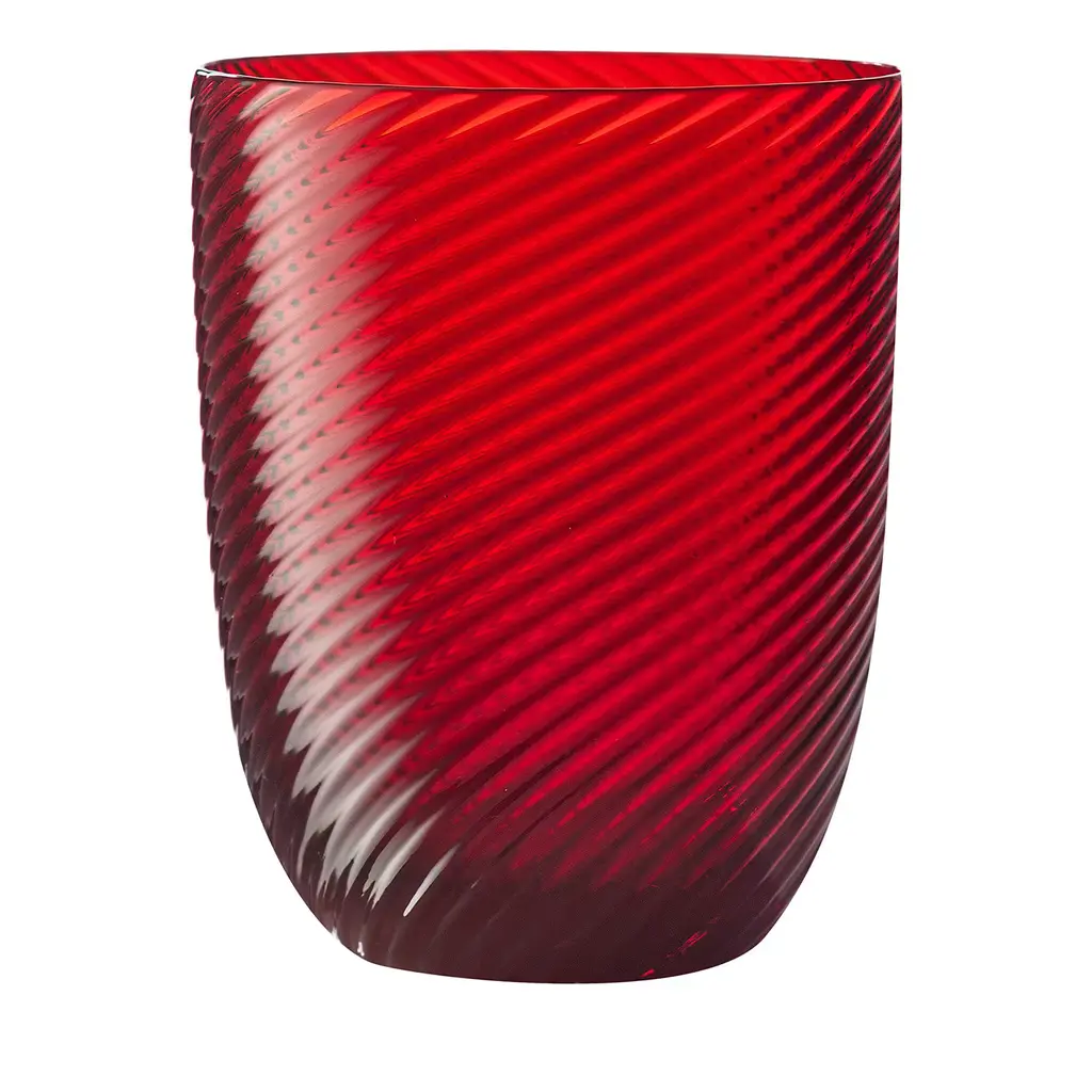 This captivating set of two water glasses merges a simple shape with an enthralling texture of raised vertical stripes executed by Murano master glassblowers. This texture creates a pleasant tactile effect when holding the glass and is achieved with a traditional technique featuring the use of a mold. A vibrant shade of red completes the modern aesthetic of the set. Please inquire with the Concierge for further color options and to have information about the available set variant of six pieces.
