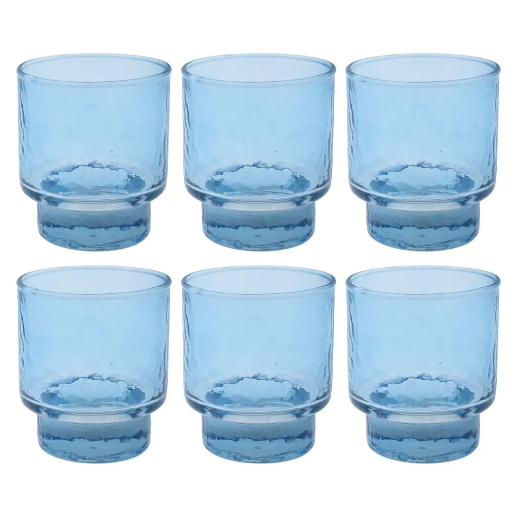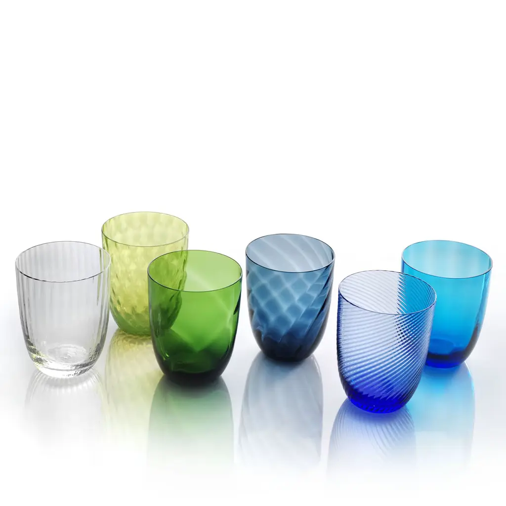 Part of the Idra Collection, this marvelous set counts six turquoise glasses each showcasing a different texture, namely lente, ottico, ottico torsé, balloton, rigadin, and torsé. An exclusive artisan crafting process employing traditional techniques is behind every glass, which is entirely unique in its detailing and weight. Different color options are available.