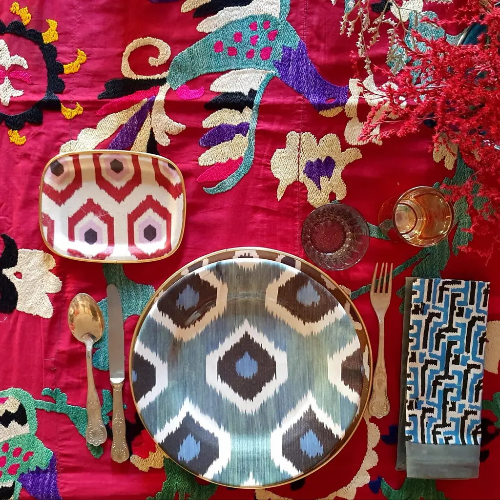 Ikat patterns are an integral part of our colorful world, celebrating the beauty of this timeless design. Inspired by its rich heritage, we’ve transformed some of our most iconic Ikat designs into a vibrant porcelain plate collection. Handmade in Italy, this set of 6 plates is perfect for adding a joyful, playful touch to your tableware collection or as stunning decorative wall pieces. These plates are designed to bring elegance and delight to every dining experience.Made in Italy100% PorcelainHand-applied decalSet of 6 Ikat Plates (same design)