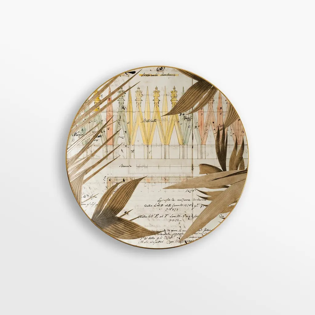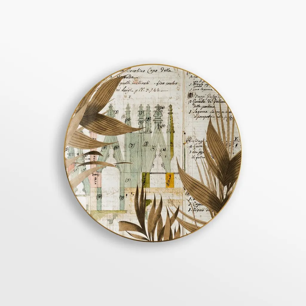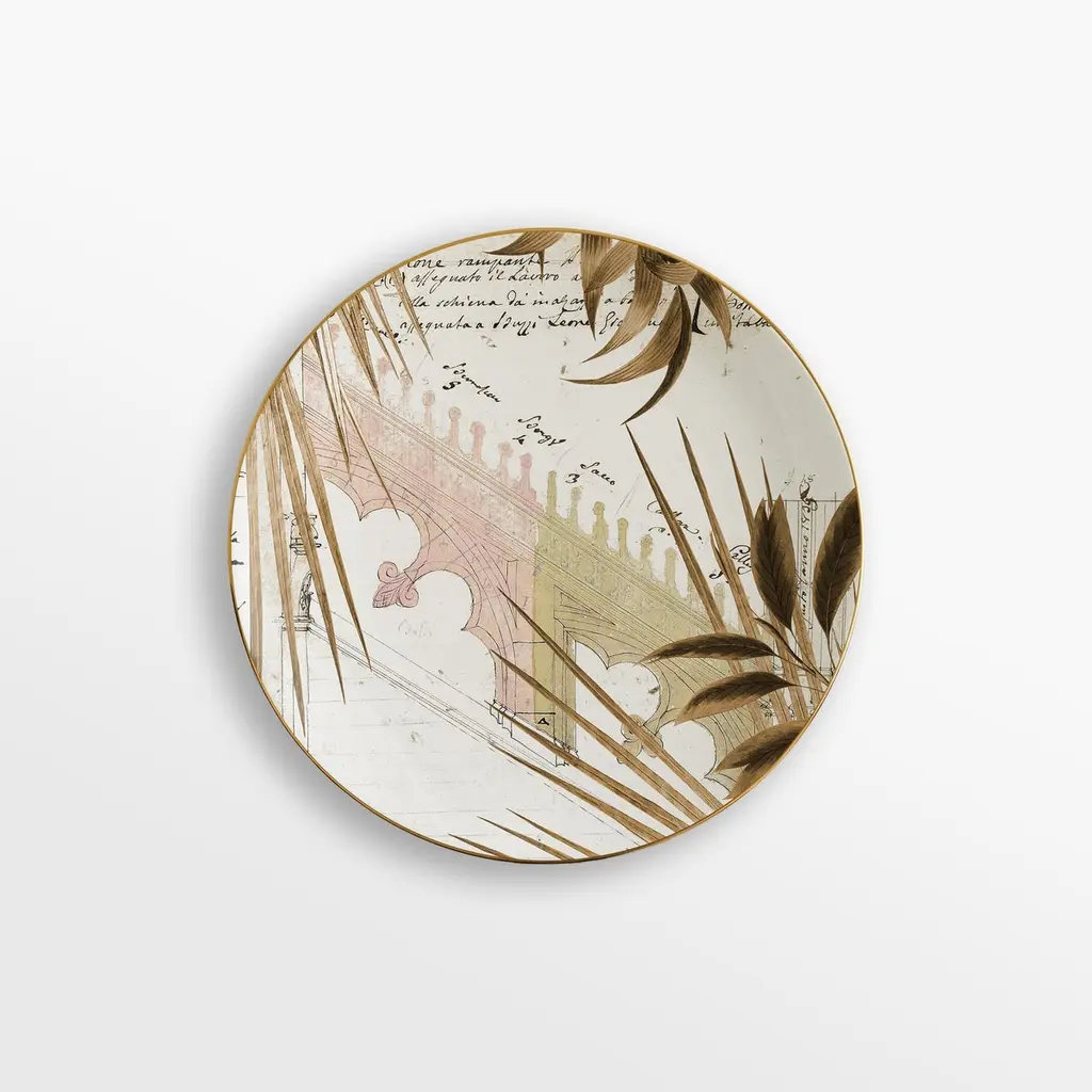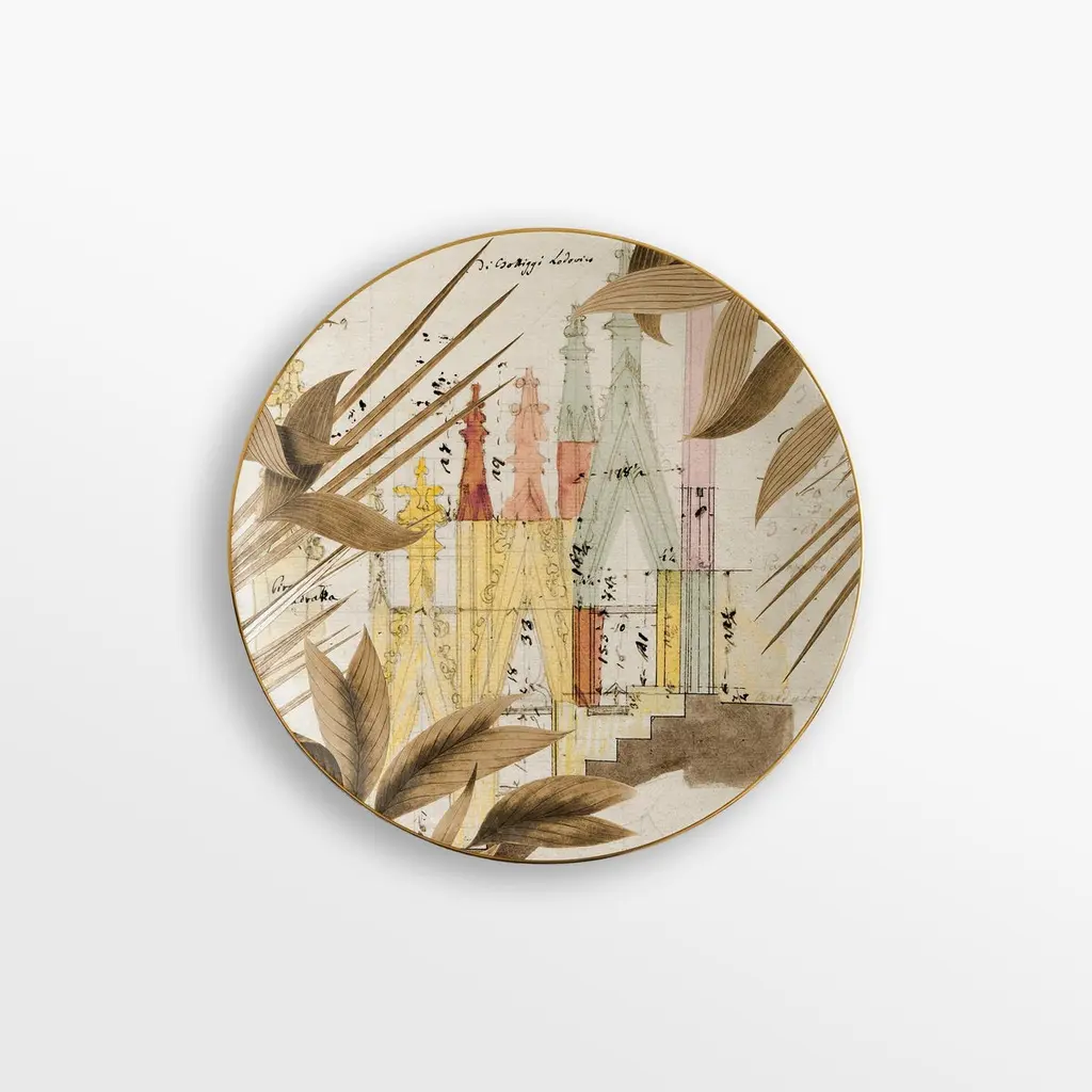From the encounter between the historical archives of the Duomo di Milano and the imagery of Grand Tour by Vito Nesta, this unique collections of porcelains and fabrics were born. “Il Duomo che Non c’e” collects a selection of the most evocative designs that were proposed in the 19th century for the reconstruction of the cathedral’s facade, enriched with yellow palm leaves, once the plants that were planted in the flower beds in front of the Duomo.Buyers, through the purchase of these collections, will contribute to the restructuring of the spiers of the Duomo as part of the proceeds will be donated to the Veneranda Fabbrica for this purpose.Set of 6 dessert plates.