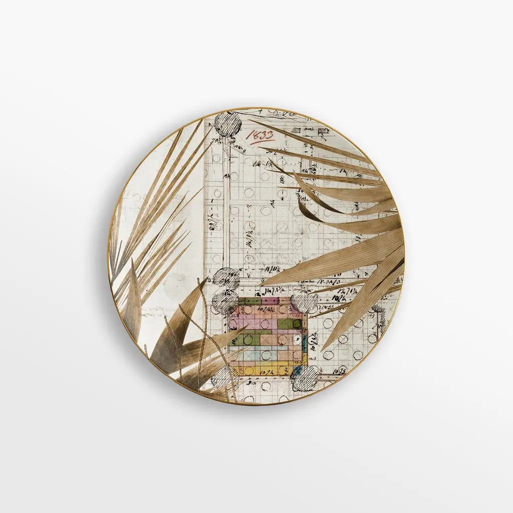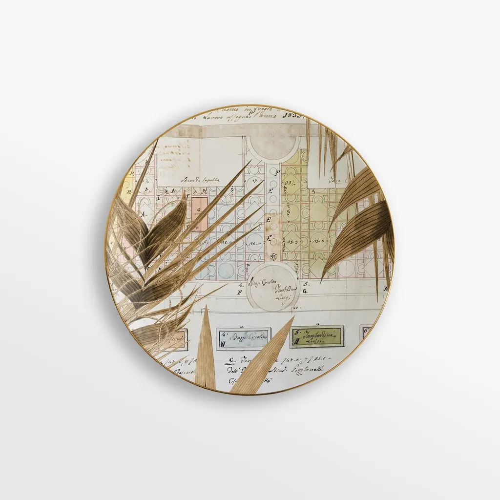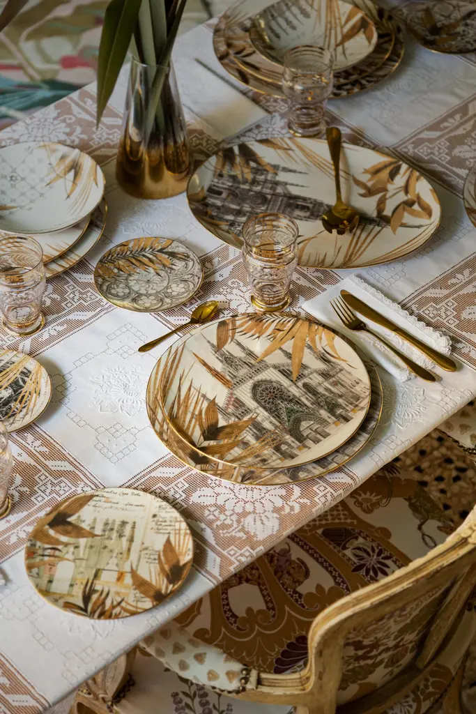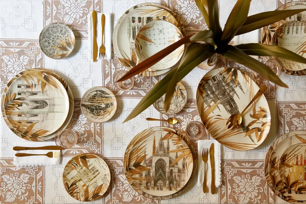 From the encounter between the historical archives of the Duomo di Milano and the imagery of Grand Tour by Vito Nesta, this unique collections of porcelains and fabrics were born. “Il Duomo che Non c’e” collects a selection of the most evocative designs that were proposed in the 19th century for the reconstruction of the cathedral’s facade, enriched with yellow palm leaves, once the plants that were planted in the flower beds in front of the Duomo.Buyers, through the purchase of these collections, will contribute to the restructuring of the spiers of the Duomo as part of the proceeds will be donated to the Veneranda Fabbrica for this purpose.Set of 6 dessert plates.