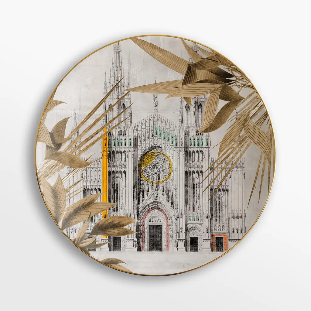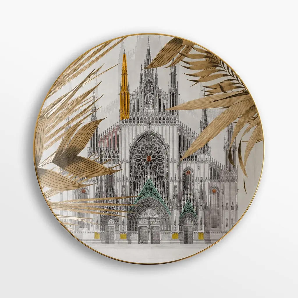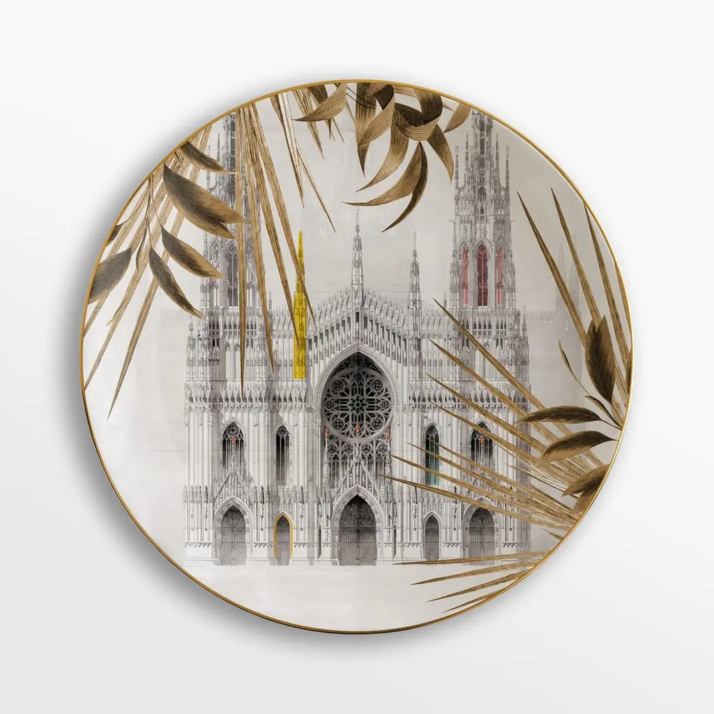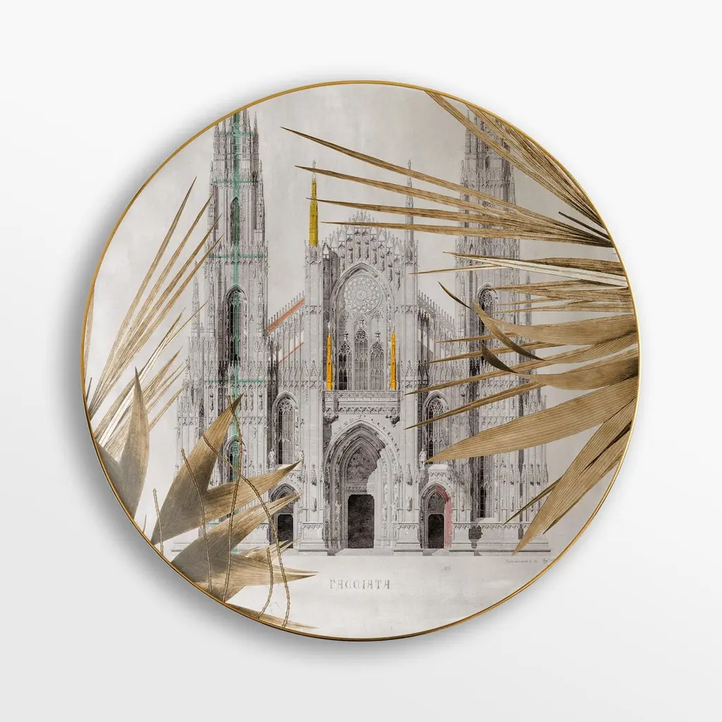 From the encounter between the historical archives of the Duomo di Milano and the imagery of Grand Tour by Vito Nesta, this unique collections of porcelains and fabrics were born. “Il Duomo che Non c’e” collects a selection of the most evocative designs that were proposed in the 19th century for the reconstruction of the cathedral’s facade, enriched with yellow palm leaves, once the plants that were planted in the flower beds in front of the Duomo.Buyers, through the purchase of these collections, will contribute to the restructuring of the spiers of the Duomo as part of the proceeds will be donated to the Veneranda Fabbrica for this purpose.Set of 6 dinner plates.