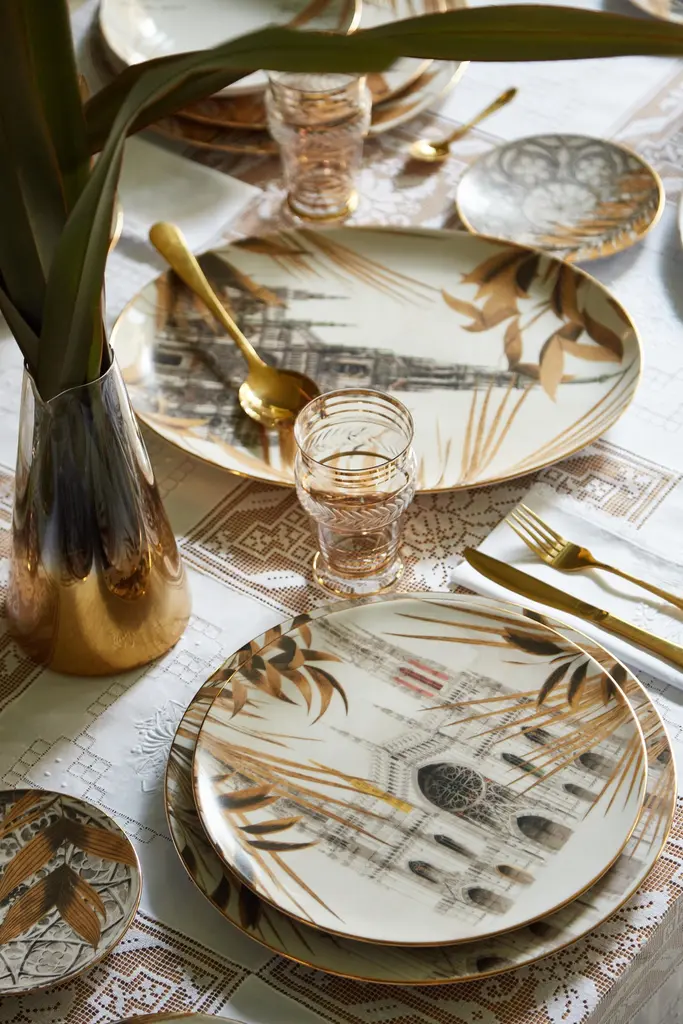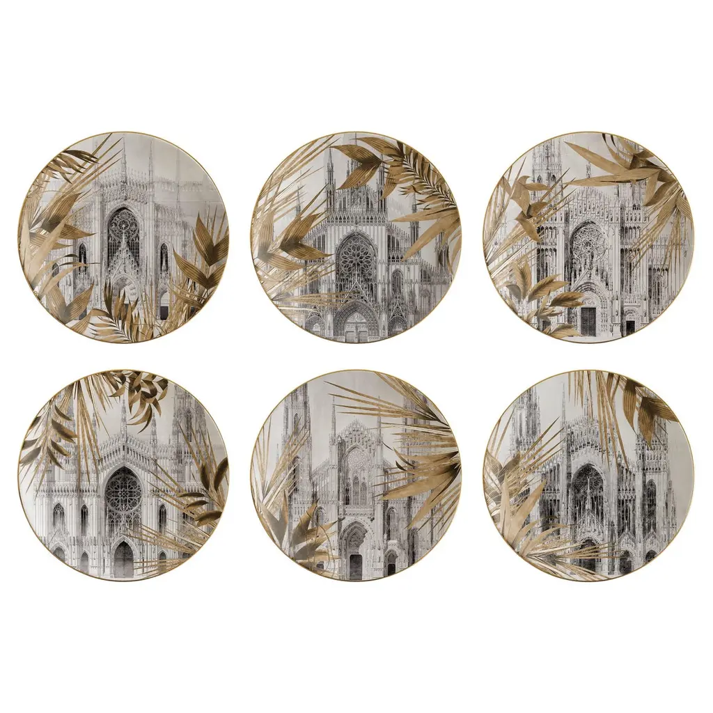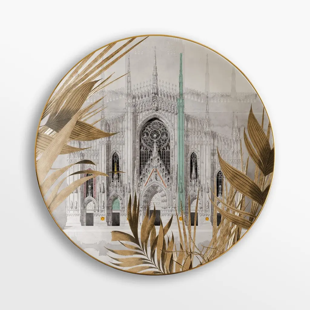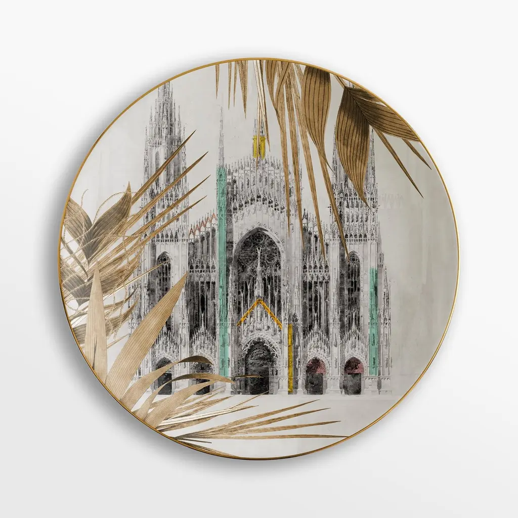 From the encounter between the historical archives of the Duomo di Milano and the imagery of Grand Tour by Vito Nesta, this unique collections of porcelains and fabrics were born. “Il Duomo che Non c’e” collects a selection of the most evocative designs that were proposed in the 19th century for the reconstruction of the cathedral’s facade, enriched with yellow palm leaves, once the plants that were planted in the flower beds in front of the Duomo.Buyers, through the purchase of these collections, will contribute to the restructuring of the spiers of the Duomo as part of the proceeds will be donated to the Veneranda Fabbrica for this purpose.Set of 6 dinner plates.
