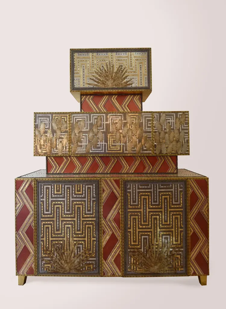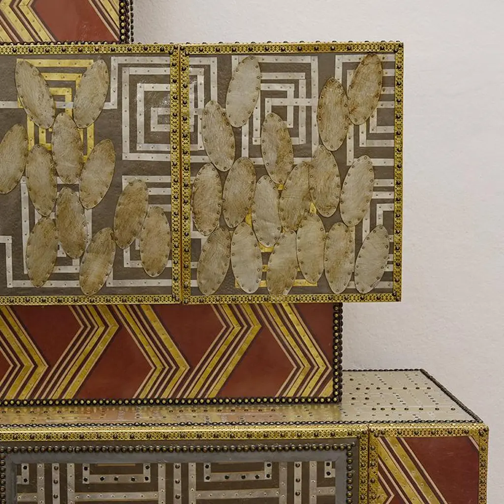 Il Moro Cupboard by Valentina GiovandoDimensions: W 163 x D 48 x H 198 cm.Materials: Wood, Fabric, Fiberglass, Brass, Zinc. Valentina Giovando, Lives and works in Sarzana, in Liguria, and for over 20 years she dedicated herself to the production of a new style. Her style is personal and full of splendour that she declines in the interior decoration through a range of high-craft artistic products. All these products are completely hand-made. Everything contributes to create unique and original pieces that mix ancient and modern, primitive and industrial, poor and precious materials, in a fascinating mix, by the capable Valentinaʼ and her artisanal team hands.
