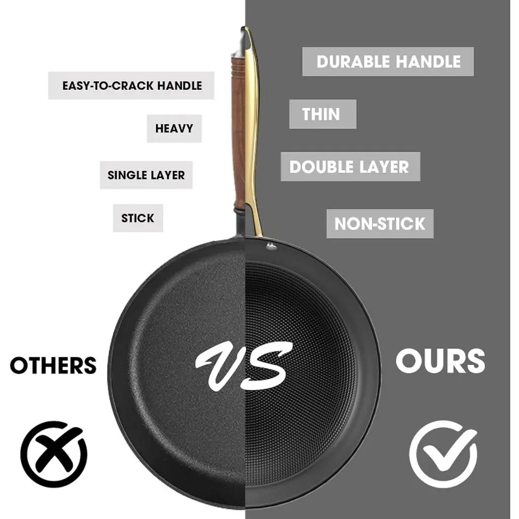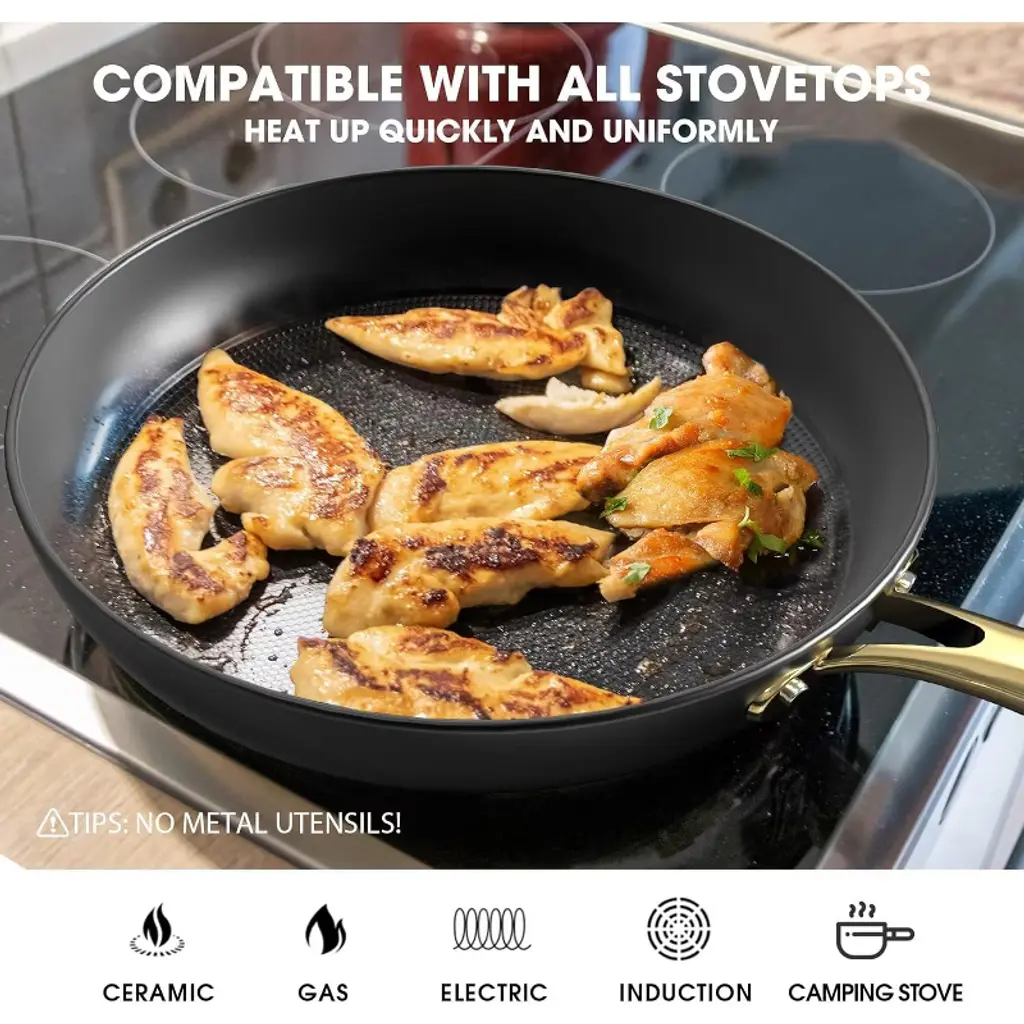 The Imarku cast iron skillet offers fast, even heat conduction and excellent heat retention, keeping food warm longer. Its honeycomb nonstick surface helps distribute oil evenly, allowing for healthier, low-fat cooking. Perfect for dishes like omelets, pizza, eggs, and bacon, the pans are versatile and suitable for all stovetops, grills, and ovens up to 500°F. With sizes of 10", they are ideal for personal or family use. The ergonomic, portable handle is designed for comfort, reducing wrist strain while offering a secure, non-slip grip. The nonstick coating is PFAS- and PFOA-free, ensuring healthy cooking with minimal oil. Easy to clean with a seamless rivet design, the pans are dishwasher safe, though hand washing is recommended for durability. Backed by a 1-year warranty and 24/7 customer service, the Imarku pans are reliable, durable, and perfect for both everyday use and outdoor cooking.