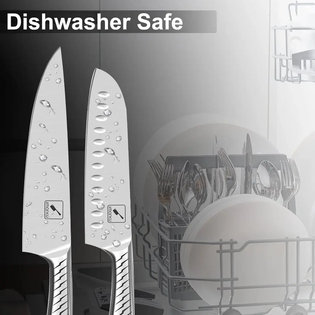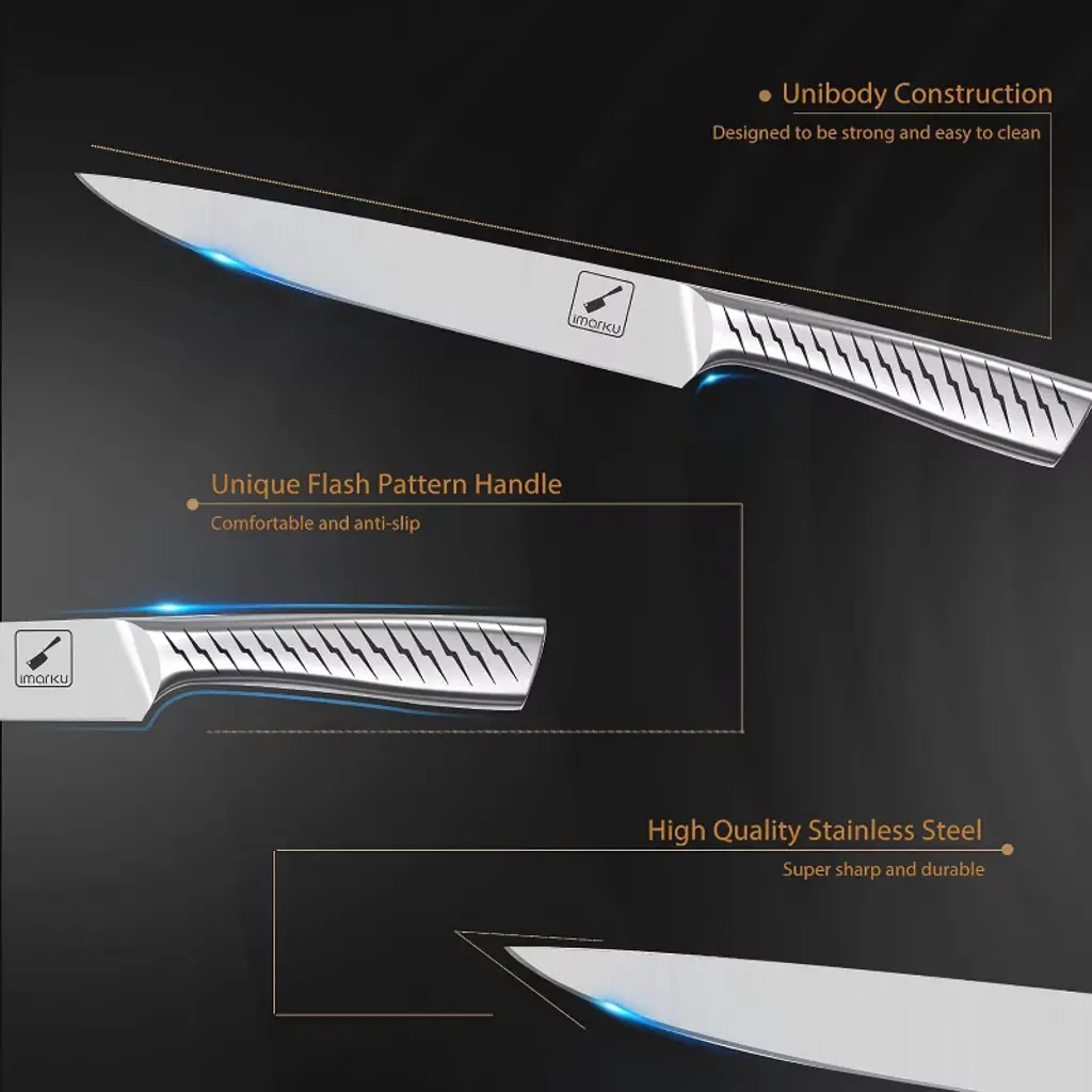 [Premium Designed Knife Set]: This kitchen knife set is made of high carbon stainless steel, which is resistance to rust, corrosion and discoloration. The special lightning stripes design not only for good looking, but also for non-slip. [Unique Ergonomic Design]: One-piece Full-Tang stainless steel handle for the sharpness, stability and balance on precise cutting. Avoid hiding filth or even cracking. The ergonomic design is easy to hold and balanced in your hand, ensures comfort and safety. [Value Knife Set]: The 14-piece knife set with block includes: 8" chef knife, 8" bread knife, 8" slicing knife, 7" santoku knife, 5" utility knife, 3.5" paring knife, 4.5" serrated steak knife set of 6, kitchen shears and a knife block which made of natural wood with finely black coating. [Easy Care & Store]: The Kitchen knife set is well organized in wood block, tidy and space-saving. Dishwasher Safe, but hand wash is better for longer sharpness and lifespan! Please wipe them dry in time after cleaning & place in dry, ventilated place. [Service]: imarku knife set comes with a beautiful and elegant gift box. Perfect gift for Housewarming, Wedding, Birthday, Thanksgiving, Christmas, Anniversary etc. Provide quality warranty, contact 24/7 support service online if you have any questions with your purchase.