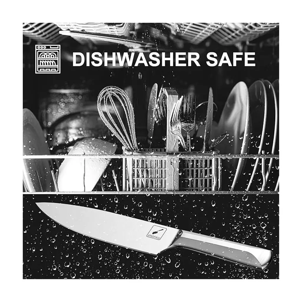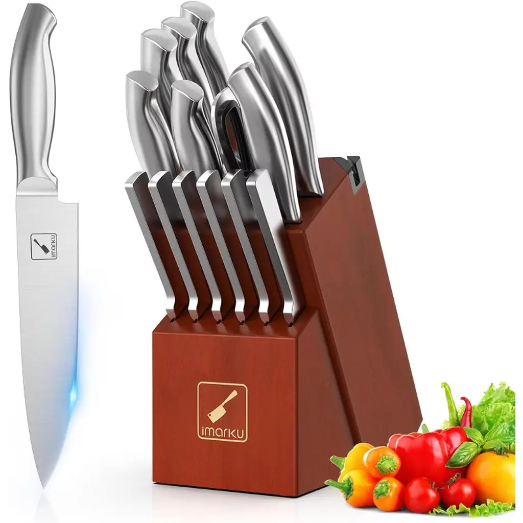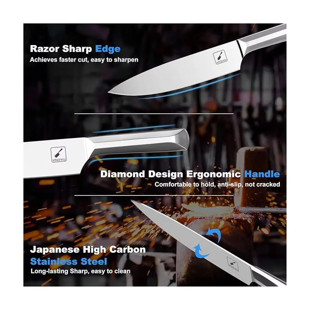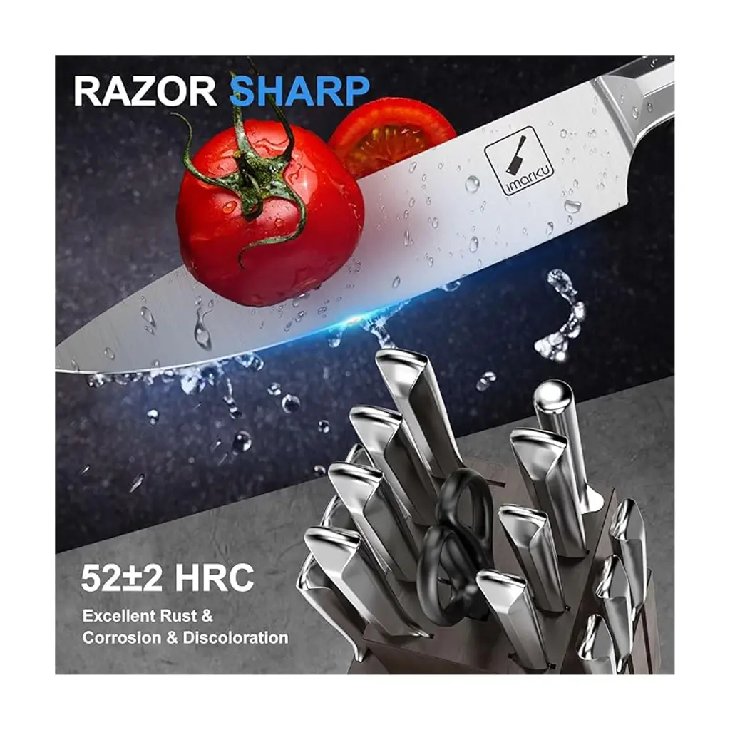 Ultra Sharp Kitchen Knife Set:All the blades of the imarku knife set are made of Japanese stainless steel with heat treatment and fine craftsmanship, achieving optimum sharpness and long-lasting razor edge retention. Enjoy exceptional cutting performance for easy slicing, dicing, and chopping in any food preparation process. Rockwell hardness 54 HRC Premium Knife Set with Stylish Block:The ultra-sharp kitchen knife set is made of high-carbon stainless steel with excellent rust, corrosion and discoloration resistance. The knife holder is made of high-quality solid wood and fine non-stick coating, and the bottom is ventilated, which is durableand style. An excellent all-in-one complete knife set for any kitchen, so you can enjoy cooking to the fullest Comfortable Ergonomics Handle:One-piece stainless steel hollow handle for perfect balance, grip and durability, better than split handles that tend to hide dirt or even break. The handle adopts a special diamond-shaped design, and the hollow handle makes the kitchen knife very easy to hold without tiring your hands. You can cut more comfortably, safely, and faster Easy Care and Storage:Imarku 16 PCS professional knife set includes: 8" chef knife, 8" bread knife, 8" slicing knife, 7" santoku knife, 6" boning knife, 5" utility knife, 3.5" paring knife, 6pcs 4.5" serrated steak Knife set, multi-purpose shears, knife sharpener and block. Kitchen Knife Sets keep knives organized, neat, and space-saving. Tip: Dishwasher safe, but hand washing is better for longer sharpness and service life Perfect Gifts & Trusted:Imarku kitchen knife set is strictly quality controlled and beautifully packaged, it is the perfect home decor gift, also suitable for fathers, mothers, housewives, birthdays, New Year, housewarming gifts, thanksgiving gifts and Christmas gifts. Designed in California, imarku focuses on developing high-quality knives dedicated to enhancing your culinary experience. imarku promises a free replacement within 1 year