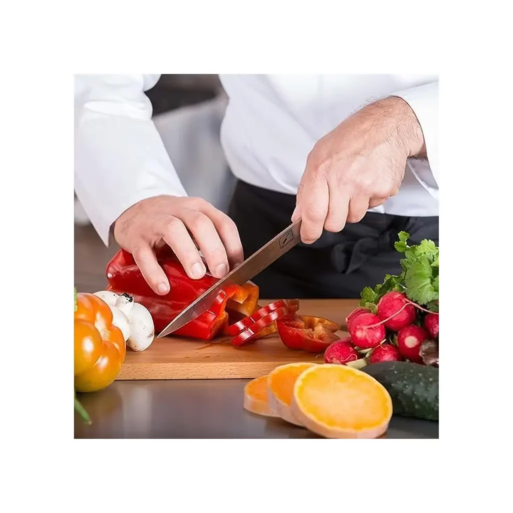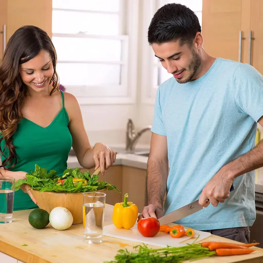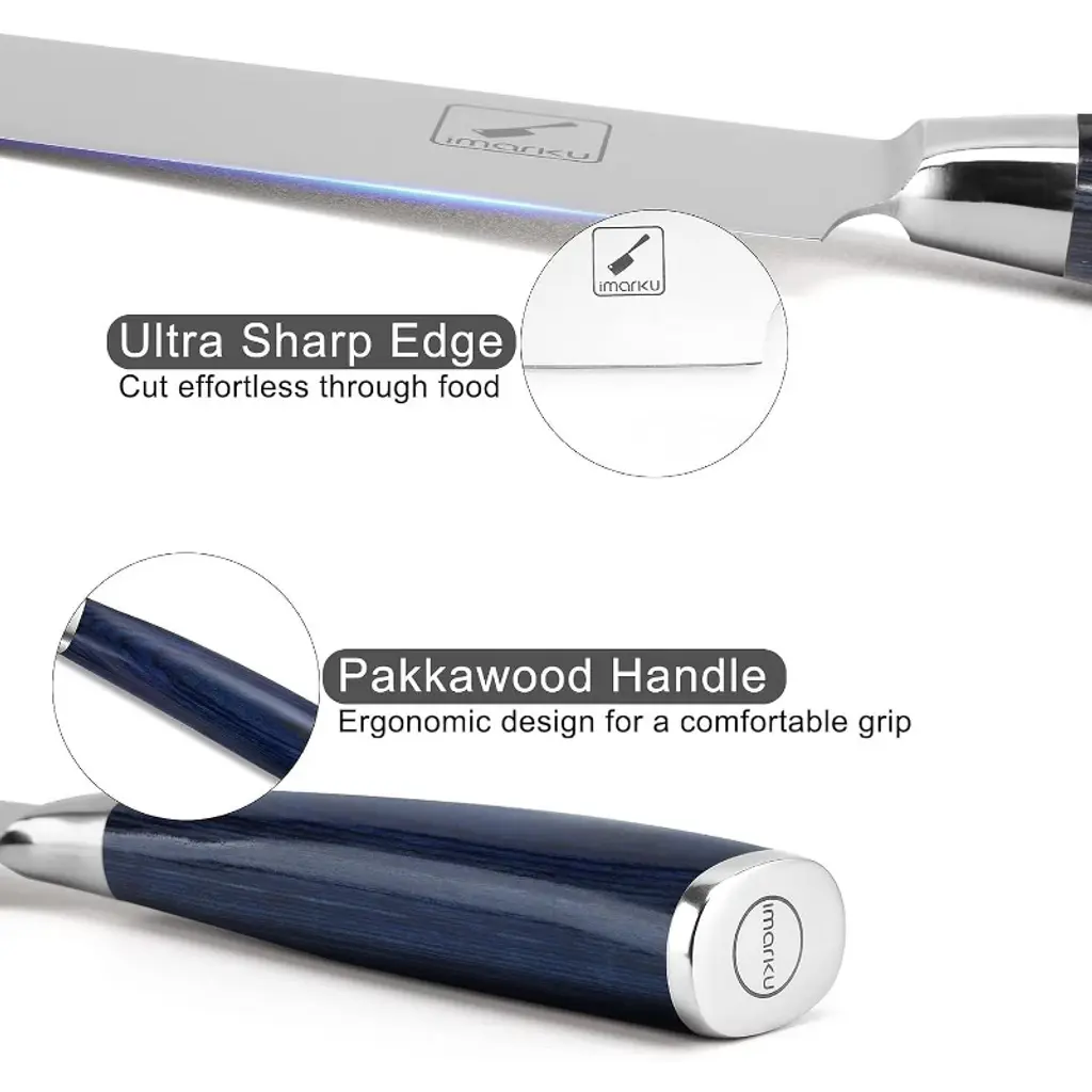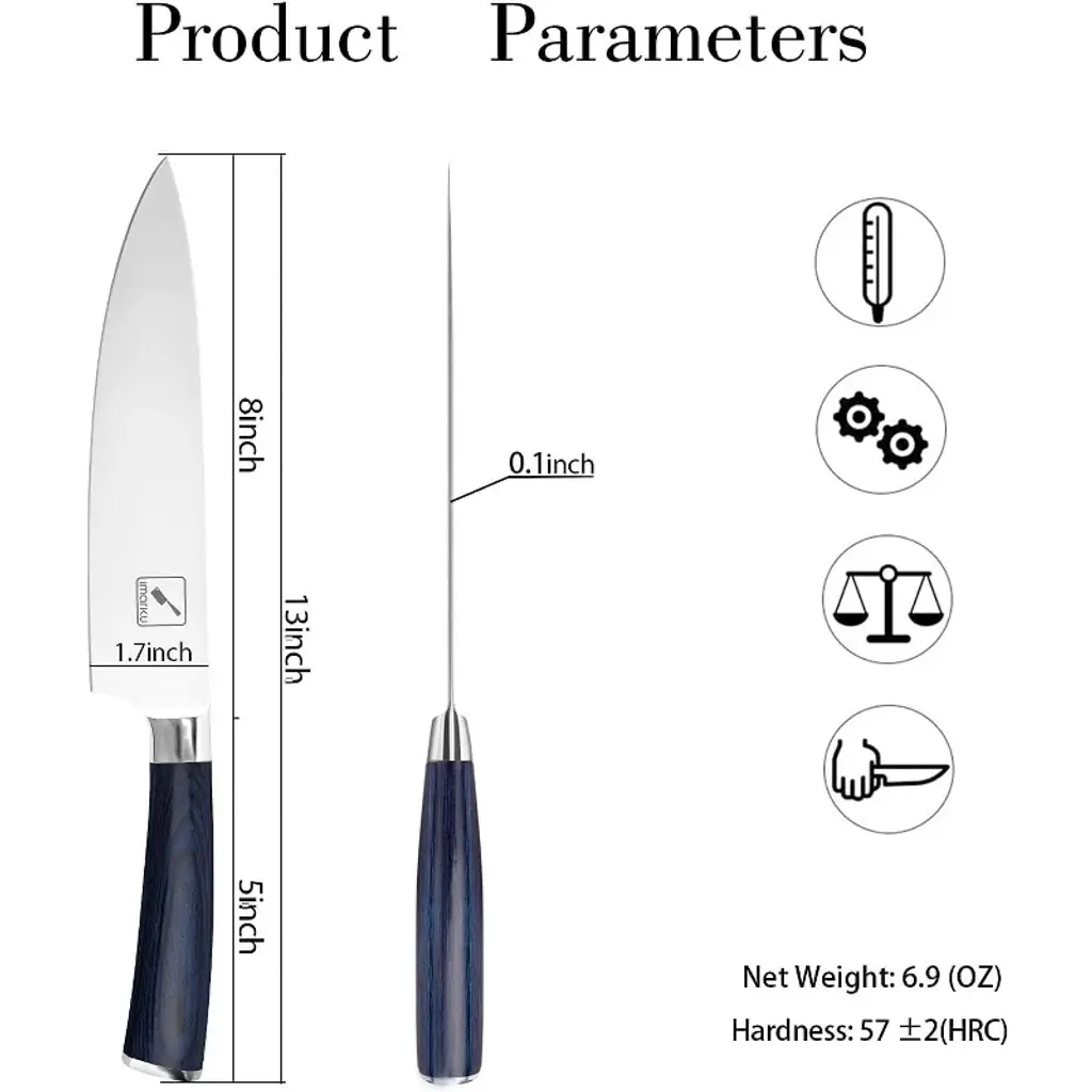 Extremely Sharp: A sharp blade is the key to optimal cutting, and the imarku chef knife features an ultra-sharp 15¡ã edge angle with a noticeably sharper surface that stays that way even after tough tasks such as cutting through tough meat or removing meat from bones.imarku knife deserves your trust Ergonomic Handle: In order to make it more professional, the chef knife handle is made of unique blue pakkawood, and the ergonomic handle and blade to achieve proper balance, minimize fatigue, numbness in the fingers, and pain after long hours of continuous gripping, and easily completing various kitchen cutting tasks Multi-functional knife: The gyutou knife is a professional all-around home cooking knife. It can cut effortlessly and precisely and is more stable and durable. The kitchen knife can cut; chop; slice; dice; and also cut meat off bones. Making you like a chef chopping vegetables and bringing you more fun in the kitchen. Good choice Fathers Day Gifts for women and men High-quality materials: In order to enhance the durability of the chef's knife, high-quality high-carbon stainless steel with a carbon content of 0.6-0.75 is used, which makes its hardness twice that of other similar knives. The metal parts of the knife blade also contain 16-18% chromium, which gives it a smooth surface that won't discolor even after prolonged use Trustworthy: If you have any questions about our knives, you can contact after-sales customer service at any time. The kitchen knife with an elegant gift box, is the perfect gift for Fathers day gifts; Thanksgiving gifts; Halloween gifts; Christmas gifts, Valentine's day and more. To maximize the performance and lifespan of a chef's knife, avoid using a dishwasher or soaking it in water
