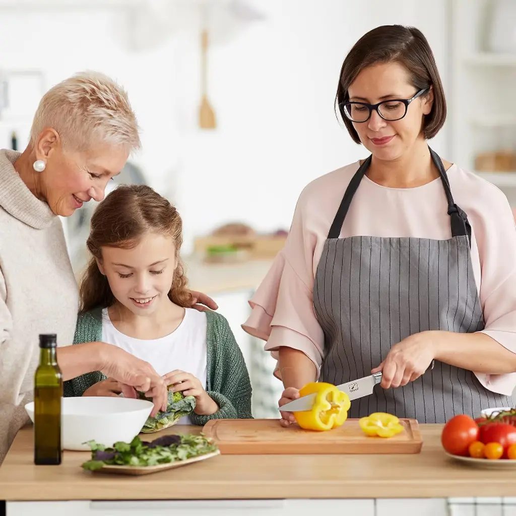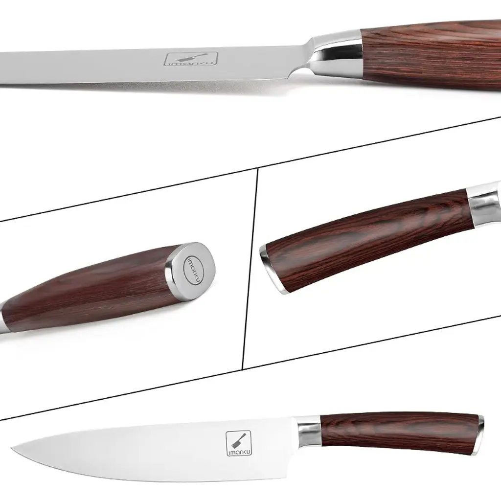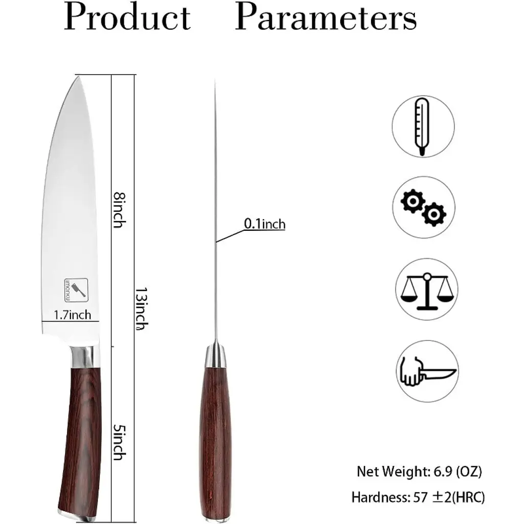 High-carbon stainless steel blade: It is manufactured from high-quality stainless steel that maintains its functionality for a long time. And to boost its sturdiness, the steel contains 0.6-0.75 carbon. This makes it two times as hard as other knives in its class as they contain about 0.3% carbon Multi-functional knife: The gyutou knife is classified and designed to be multipurpose knife for professional applications .It cuts,dices,slices,chops and also cuts meat off bones. It comes with a HRC( Rockwell Hardness Scale) of 56-58 which makes it among the tough knives in its class Ergonomic pakka handle: To make it more professional and minimize any fatigue, finger numbness or aches after holding it continuously for an extended time the knife's handle is made from Pakka. This is material that originates from Africa and its known for its comfort; strength and stability Ultra-sharp edge: Sharpness is key to achieving the best cuts and this is evident in the knife's blade which is quite sharp and will remain this way even after tough tasks such as cutting tough meat or removing flesh from bones. The sharpness is further boosted by use of the latest German engineering Corrosion and stainless blade: In addition to carbon, 16-18% chrome is also included in the blade's metal composition. This gives its a glossy finish which will not tarnish even after using it for a long time, making it the perfect gift for Birthday gifts; Thanksgiving gifts; Halloween gifts and more