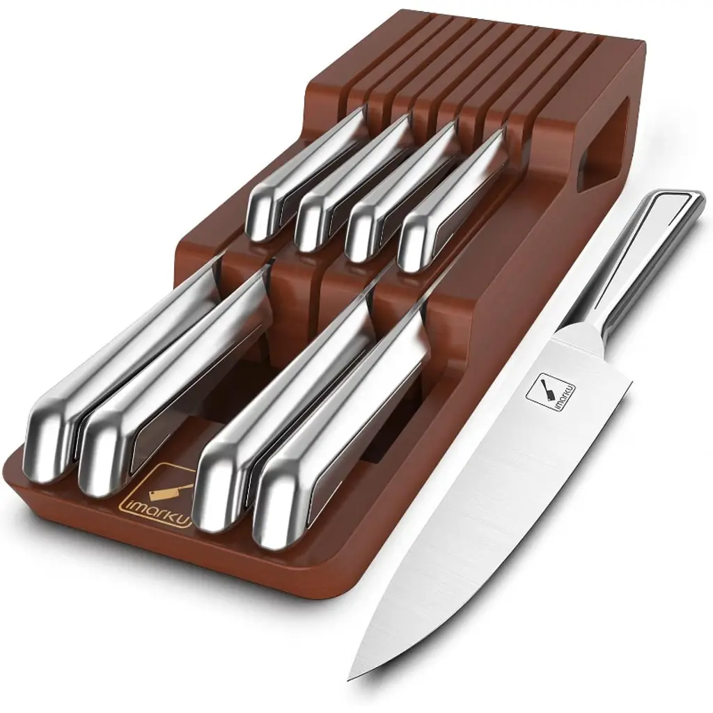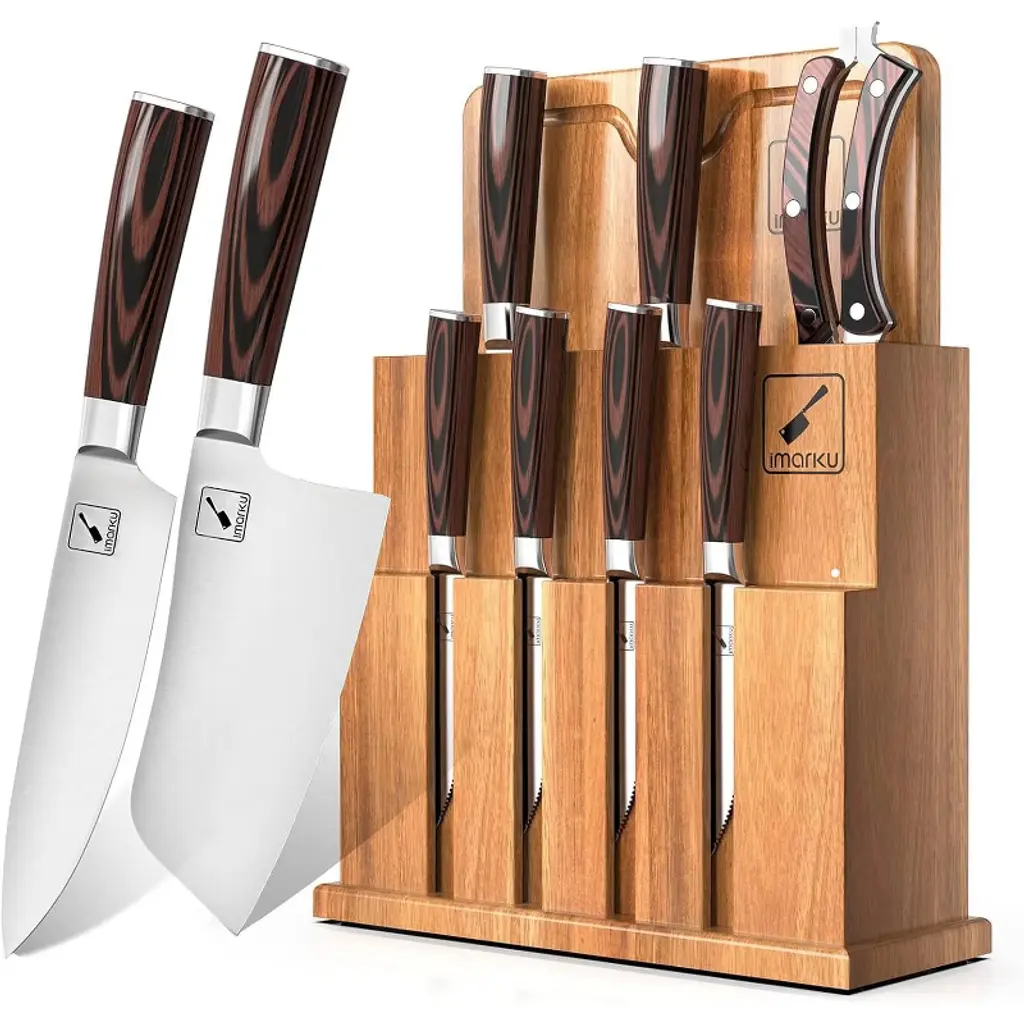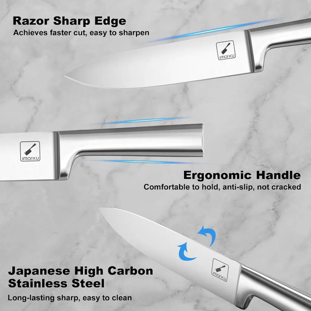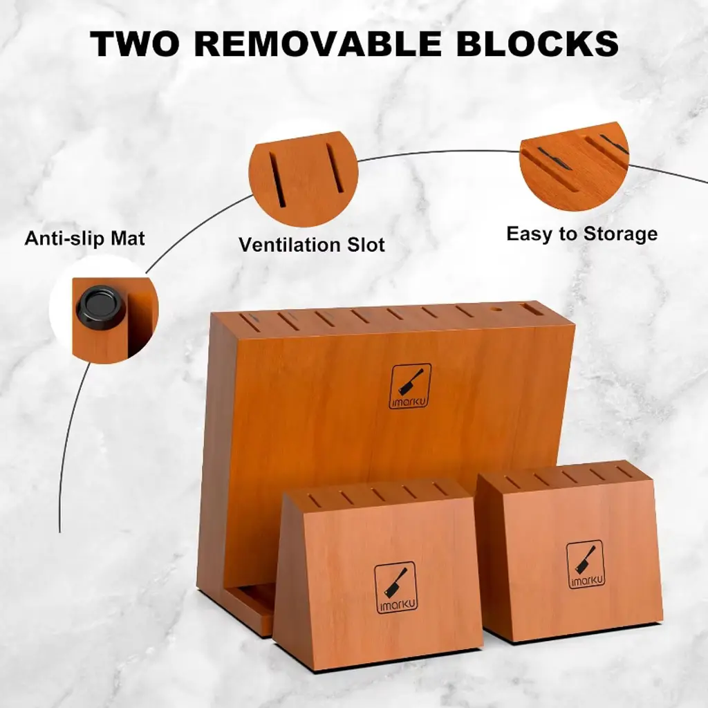 Ultra Sharp Knives Set: All the blades of the imarku kitchen knife sets are made of Japanese stainless steel with heat treatment and fine craftsmanship, achieving optimum sharpness and long-lasting razor edge retention. Enjoy exceptional cutting performance for easy slicing, dicing, and chopping in any food preparation process. Premium Knife Set with Two Removable Blocks: The ultra-sharp kitchen knife set is made of high-carbon stainless steel with excellent rust, corrosion, and discoloration resistance. The knife holder is made of high-quality solid wood and fine non-stick coating. Store the knives in any convenient location with the two removable blocks. Easily experience free placement and free access. Comfortable Ergonomics Handle: One-piece stainless steel hollow handle for perfect balance, grip and durability, better than separated handles that is easy to hide filth or even crack. Plus the wider finger bolster for extra control, the full tang kitchen knife is so comfortable to hold that you can cut easier, safer and faster. Easy Care & Store: imarku 20 Pcs value knives set includes: 8" chef knife, 7" santoku knife, 6" chef knife, 8" bread knife, 8" slicing knife, 5" utility knife, 3" paring knife, 10 pcs 4.7" serrated steak knife sets, multi-purpose shears, knife sharpener and block. Kitchen knife sets with block keep knives organized, neat and space-saving. Tip: Dishwasher safe, but hand washing is better for longer sharpness and service life. Trustworthy & Perfect Gifts:imarku kitchen knife set is strictly quality-controlled and beautifully packaged. It is the perfect home decor gift, also suitable for Monther¡¯s Day gift, Father¡¯s Day gift, Weddings, Birthday, Housewarming, Thanksgiving, Christmas.