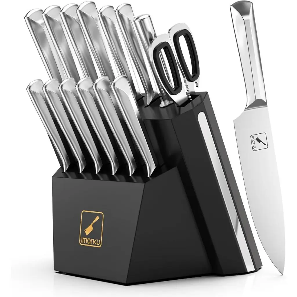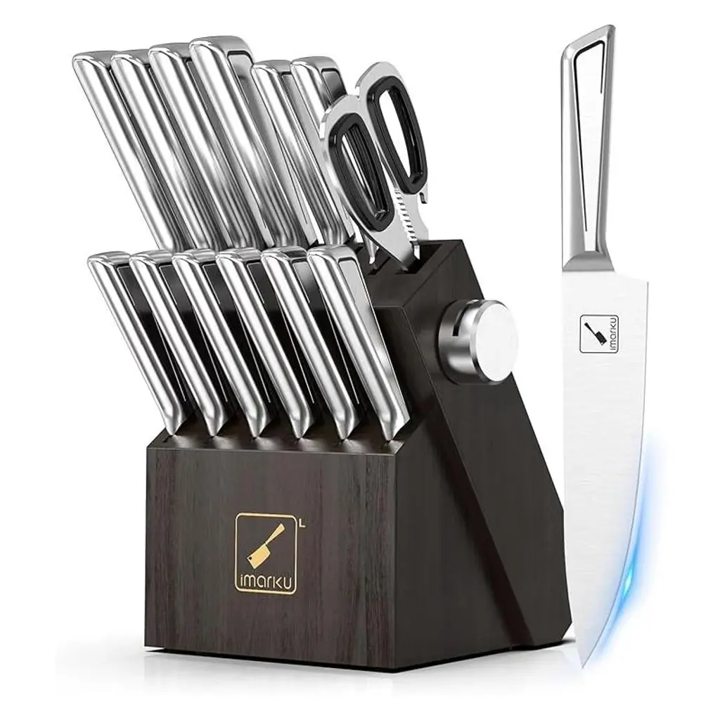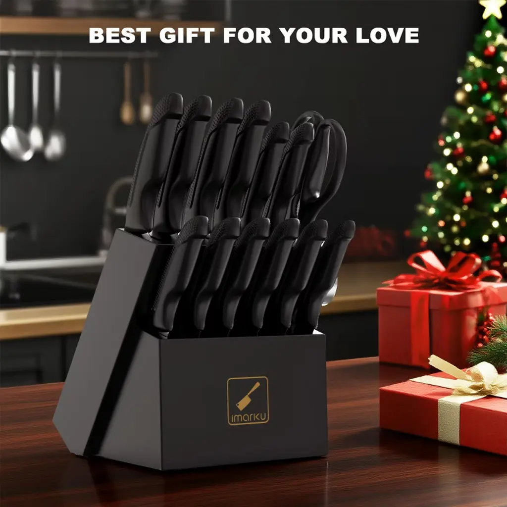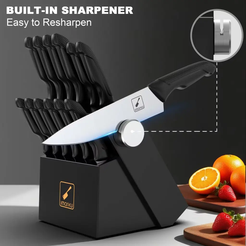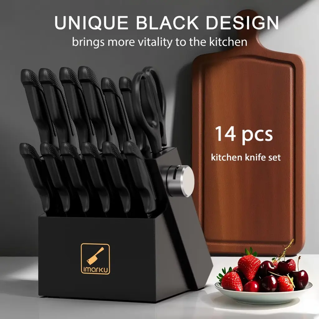 Ultimate Precision and Durability: The imarku premium sharp knife set boasts ultra-sharp blades made from Japanese stainless steel, ensuring effortless cutting and long-lasting use. With an ergonomic design and built-in sharpener, our knife set is ideal for both home cooks and professional chefs Comfortable and Safe to Use: Featuring an anti-slip handle design to ensure a comfortable, balanced grip that prevents accidental slips, imarku knives are perfect for everyday use. With a curved design that reduces hand strain and fatigue, our knives are both practical and safe to use All-in-One Knife Set: Get more done in the kitchen with our 14-piece knife set, including a chef's knife, serrated bread knife, slicing knife, Santoku knife, paring knife, utility knife, six steak knives, kitchen shears, and hardwood knife block with a built-in sharpener. Each knife is neatly organized and ready to use Easy to Clean and Maintain: Cleanup is a breeze with our dishwasher-safe knife set. To maintain their sharpness, we recommend a quick rinse and gentle hand washing. The knife block can be easily wiped down to keep your storage area neat and organized Perfect Gift for Any Occasion: Surprise your loved ones with the gift of culinary expertise. Our beautifully boxed and quality-controlled imarku kitchen knife set is perfect for any occasion, including housewarming, birthdays, Christmas, or as a special treat for yourself. Any questions our professional customer support is always here for you