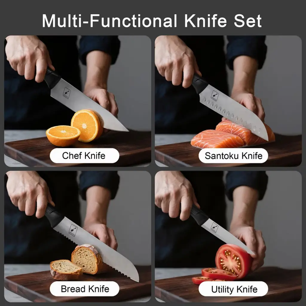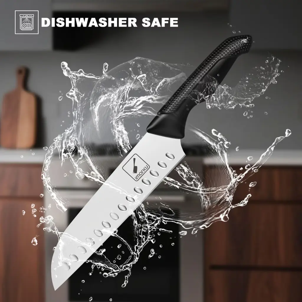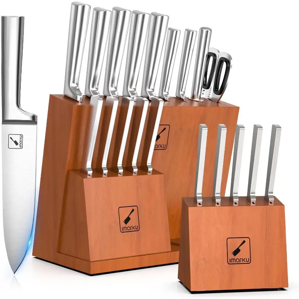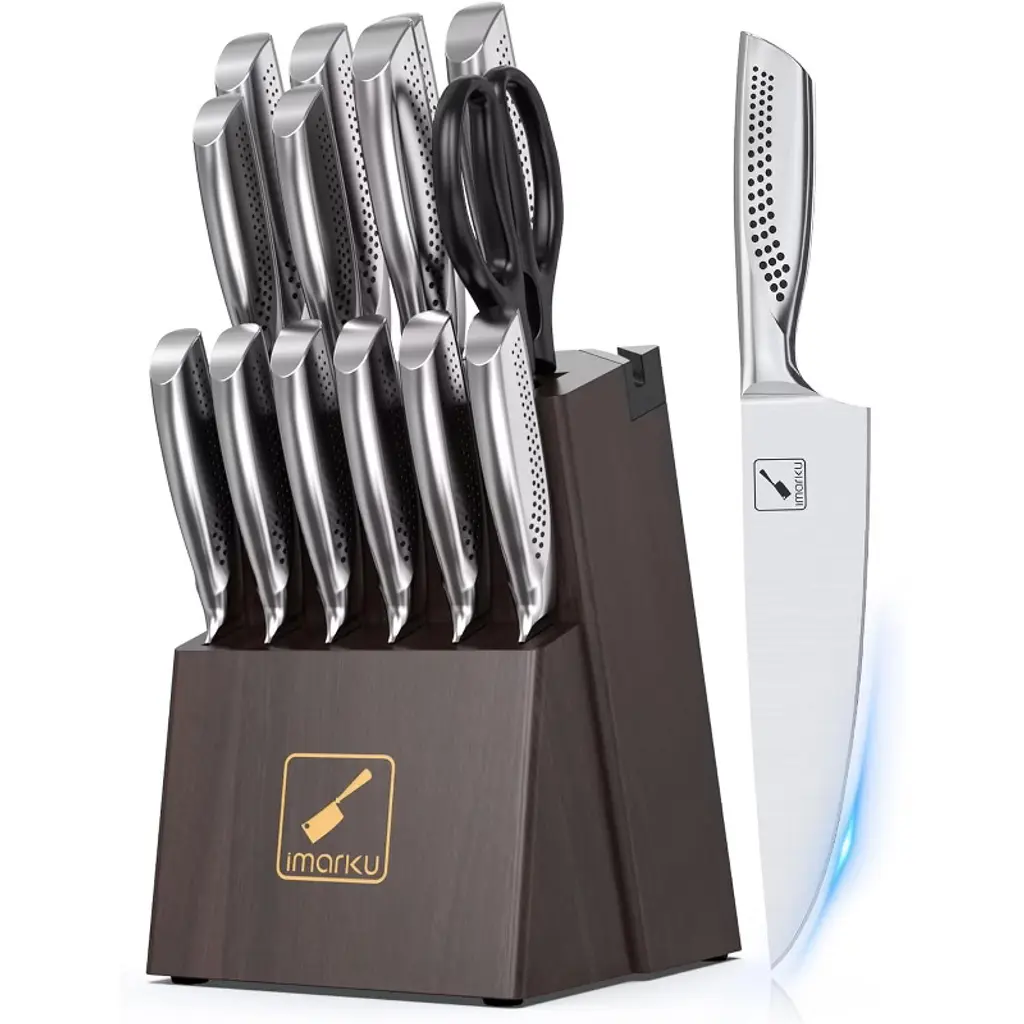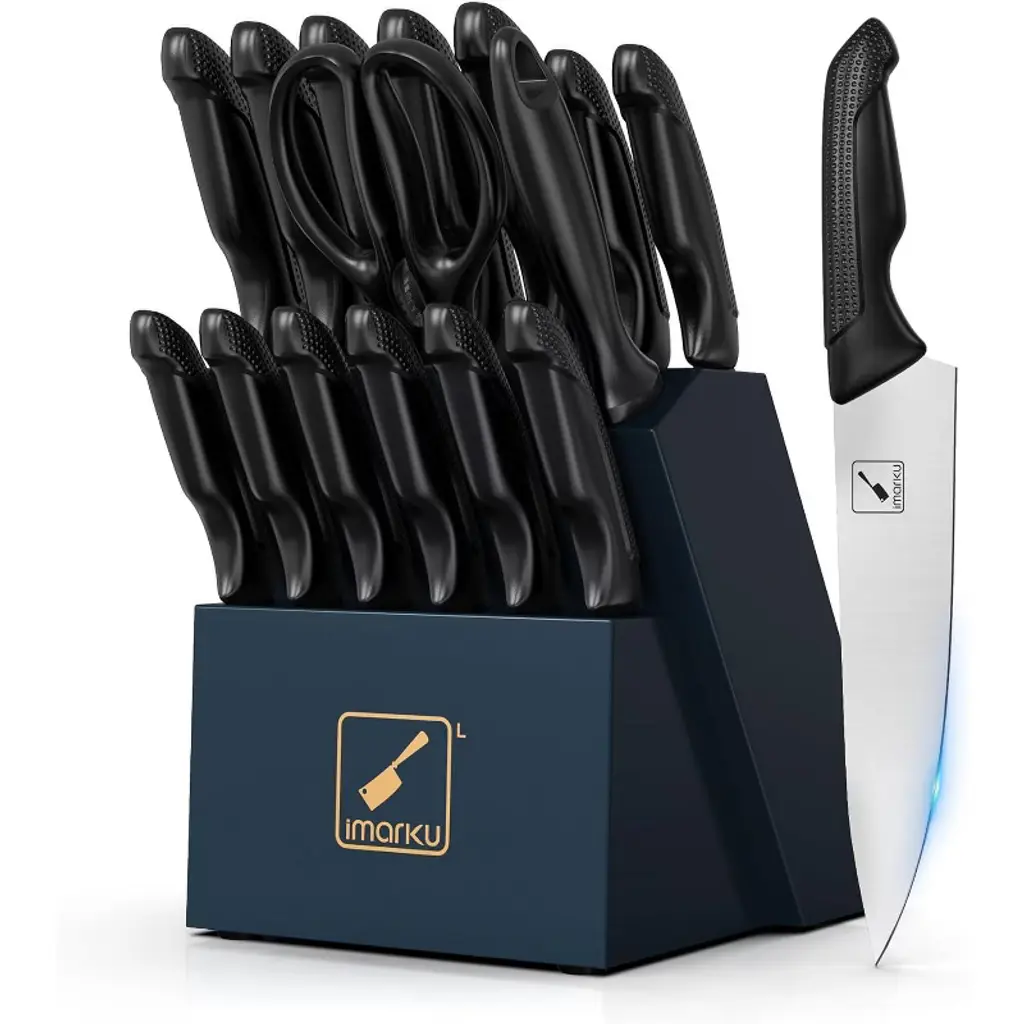 Ultimate Precision and Durability: The imarku premium sharp knife set boasts ultra-sharp blades made from Japanese stainless steel, ensuring effortless cutting and long-lasting use. With an ergonomic design and built-in sharpener, our knife set is ideal for both home cooks and professional chefs Comfortable and Safe to Use: Featuring an anti-slip handle design to ensure a comfortable, balanced grip that prevents accidental slips, imarku knives are perfect for everyday use. With a curved design that reduces hand strain and fatigue, our knives are both practical and safe to use All-in-One Knife Set: Get more done in the kitchen with our 14-piece knife set, including a chef's knife, serrated bread knife, slicing knife, Santoku knife, paring knife, utility knife, six steak knives, kitchen shears, and hardwood knife block with a built-in sharpener. Each knife is neatly organized and ready to use Easy to Clean and Maintain: Cleanup is a breeze with our dishwasher-safe knife set. To maintain their sharpness, we recommend a quick rinse and gentle hand washing. The knife block can be easily wiped down to keep your storage area neat and organized Perfect Gift for Any Occasion: Surprise your loved ones with the gift of culinary expertise. Our beautifully boxed and quality-controlled imarku kitchen knife set is perfect for any occasion, including housewarming, birthdays, Christmas, or as a special treat for yourself. Any questions our professional customer support is always here for you