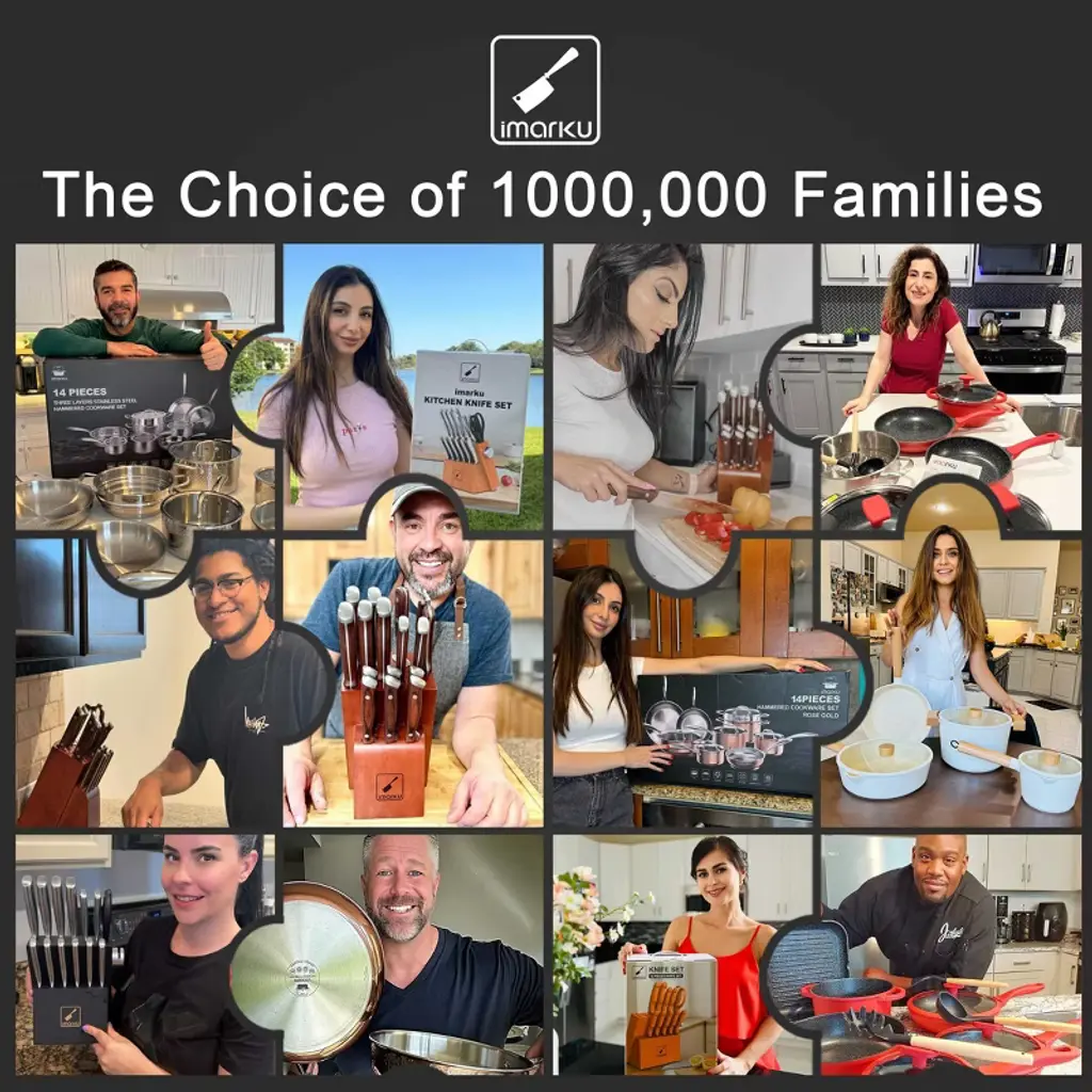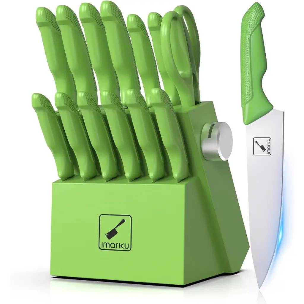 Ultimate Precision and Durability: The imarku premium sharp knife set boasts ultra-sharp blades made from Japanese stainless steel, ensuring effortless cutting and long-lasting use. With an ergonomic design and built-in sharpener, our knife set is ideal for both home cooks and professional chefs Comfortable and Safe to Use: Featuring an anti-slip handle design to ensure a comfortable, balanced grip that prevents accidental slips, imarku knives are perfect for everyday use. With a curved design that reduces hand strain and fatigue, our knives are both practical and safe to use All-in-One Knife Set: Get more done in the kitchen with our 14-piece knife set, including a chef's knife, serrated bread knife, slicing knife, Santoku knife, paring knife, utility knife, six steak knives, kitchen shears, and hardwood knife block with a built-in sharpener. Each knife is neatly organized and ready to use Easy to Clean and Maintain: Cleanup is a breeze with our dishwasher-safe knife set. To maintain their sharpness, we recommend a quick rinse and gentle hand washing. The knife block can be easily wiped down to keep your storage area neat and organized Perfect Gift for Any Occasion: Surprise your loved ones with the gift of culinary expertise. Our beautifully boxed and quality-controlled imarku kitchen knife set is perfect for any occasion, including housewarming, birthdays, Christmas, or as a special treat for yourself. Any questions our professional customer support is always here for you