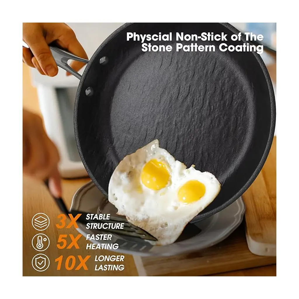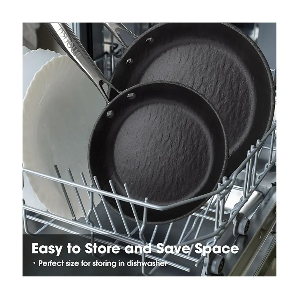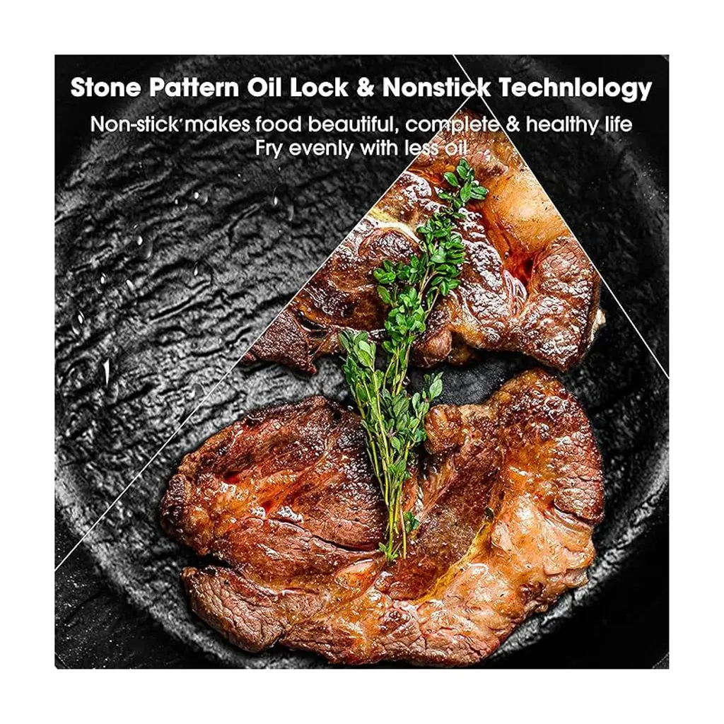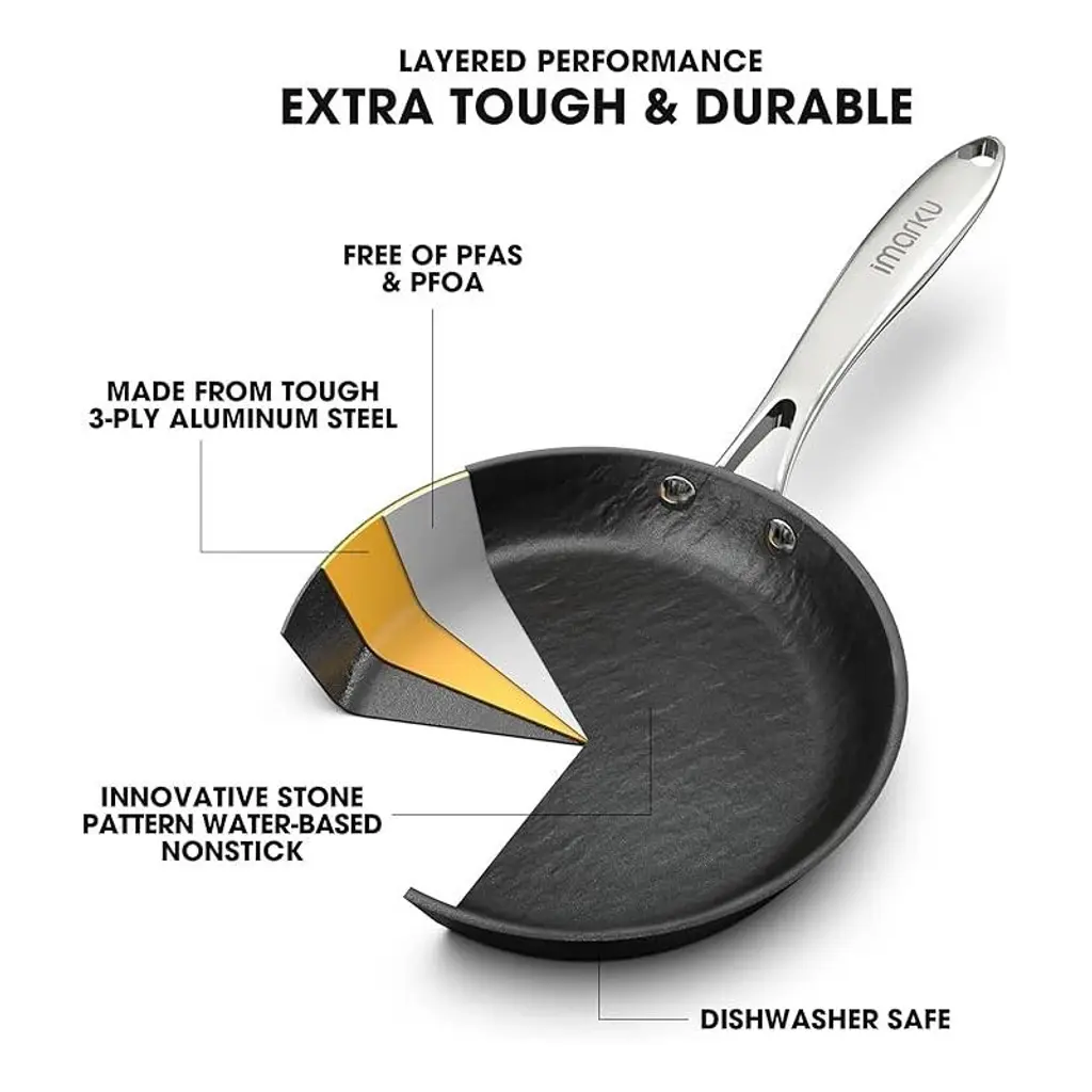 Imarku cast iron pan set ensures fast, even heat conduction and excellent heat retention, keeping food warm longer. Its honeycomb nonstick design evenly distributes oil, requiring less fat for healthier, flavorful cooking—ideal for omelets, pizzas, and steaks. Compatible with all stoves and ovens up to 500°F, the 8" is portable no matter for home, travel, or outdoor use. The reinforced PFAS- and PFOA-free coating guarantees safe, easy food release and effortless cleaning—dishwasher safe though hand wash is recommended. Ergonomically designed handles provide a secure, comfortable grip, reducing wrist strain and improving balance for precise control. Built for durability and convenience, this set combines performance with health-conscious design. Backed by a 1-year warranty and 24/7 customer support, Imarku pans offer reliability and professional cooking results for any kitchen or occasion.