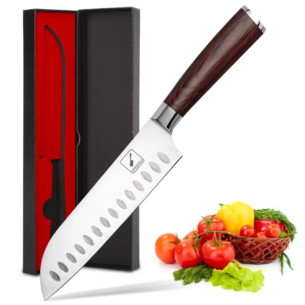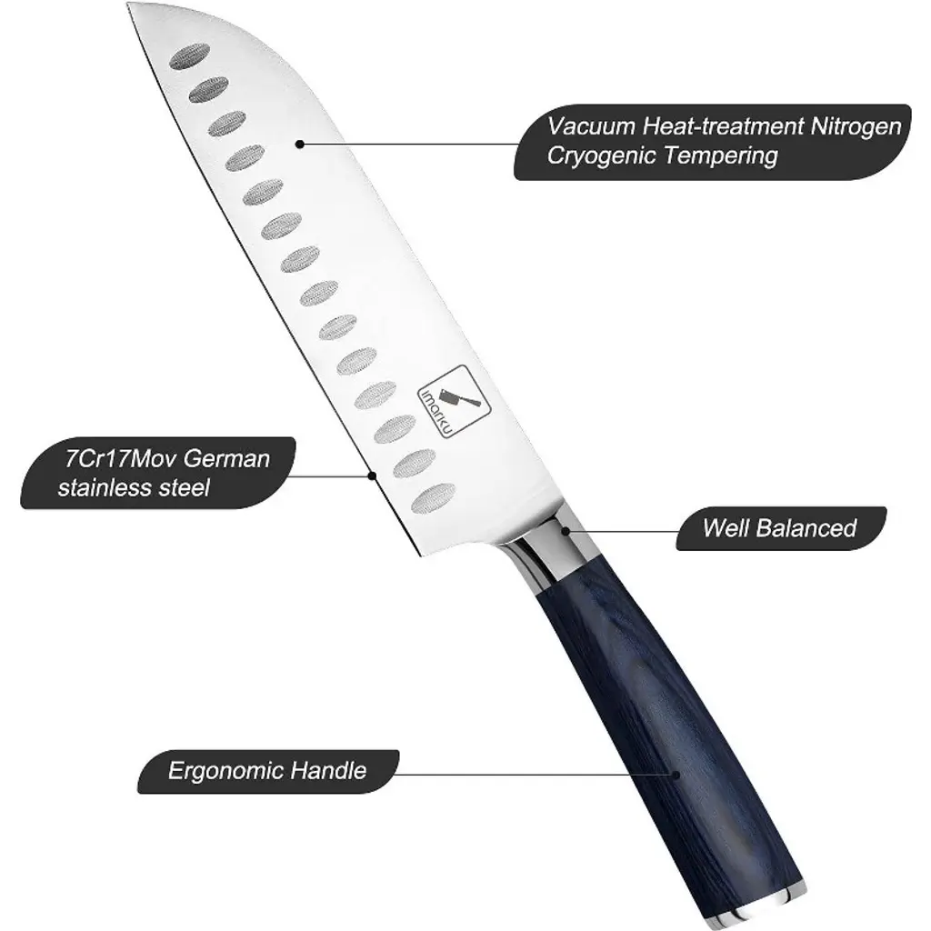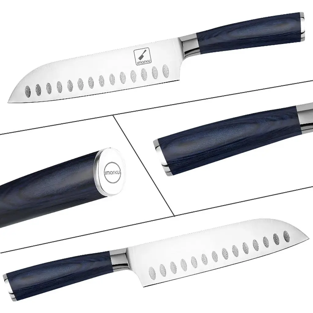 Professional Santoku Knife: This imarku Super Sharp Santoku Knife is made of German HC stainless steel that resists rust, corrosion, and discoloration. It can be used for your daily kitchen tasks of chopping, slicing, dicing, and mincing of all kinds of meat, vegetables, fruits, and bread. It is suitable for both home and restaurant kitchens Ultra-Sharp Edge:This kitchen knife is very sharp and has undergone many rigorous tests. It will be perfect for both home and professional kitchens. The thickness of this kitchen knife is 2.5mm. Its hand-polished edge is 15-18 degrees per side, which is sturdy and sharp to get the job done perfectly Ergonomic Design:The handle of this Santoku knife is blue and ergonomically designed. The Parkwood handle makes it very easy to cut with this knife. The ergonomic handle reduces the pressure on the grip, so you won't feel your wrist getting tired even after long hours of use. This Santoku knife is perfect for housewives, cooking enthusiasts, and professional chefs Unique Blade Design:This 7" Santoku chef's knife is designed with a unique hollow oval edge on both sides of the blade. This unique design prevents vegetables and meat from sticking to the blade when using this knife to cut vegetables or meat. This Santoku chefs knife will give you a great experience when slicing, dicing, and chopping Guarantee&Exquisite Gifts:We have a perfect after-sales service system to provide you with satisfactory service. This knife comes in a very nice package, perfect for birthday gift, Christmas gift, Thanksgiving gift, etc