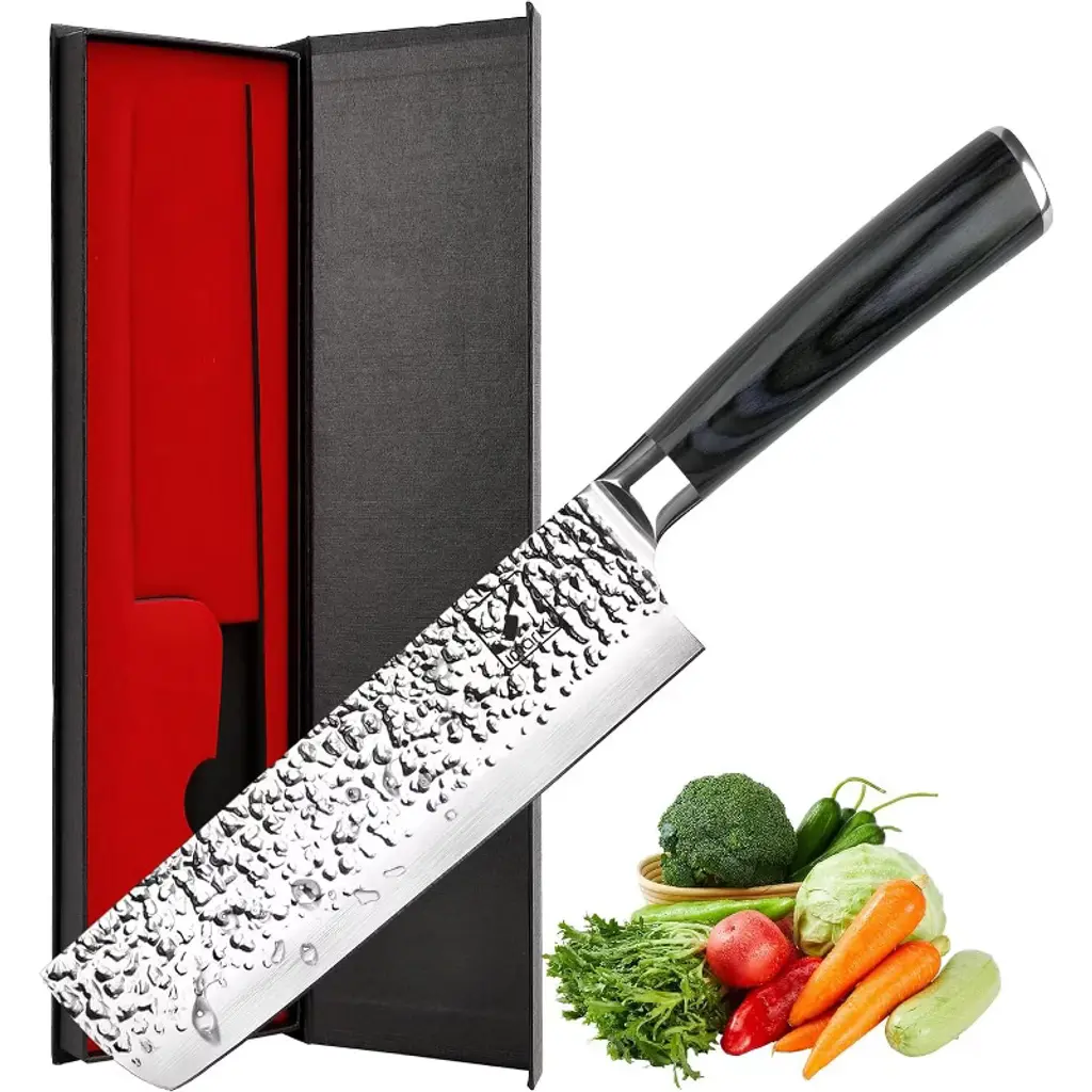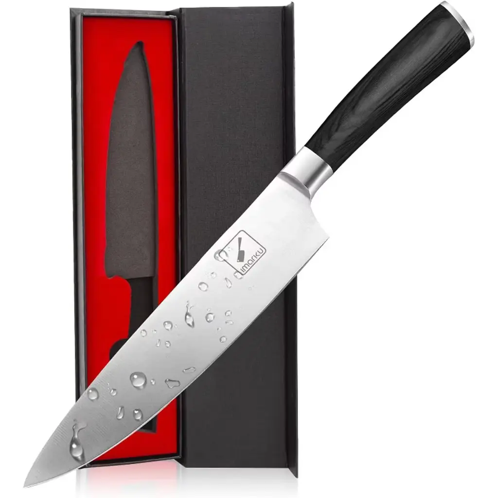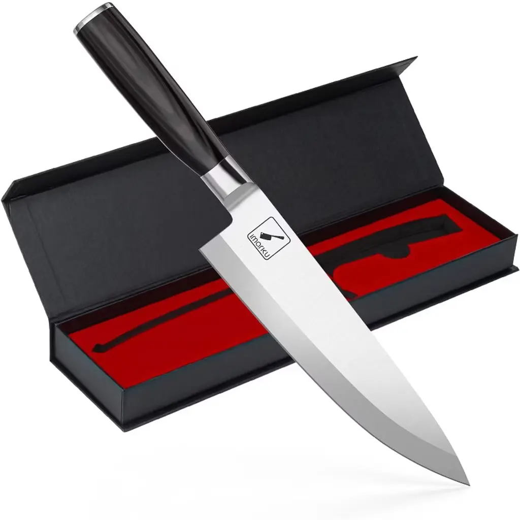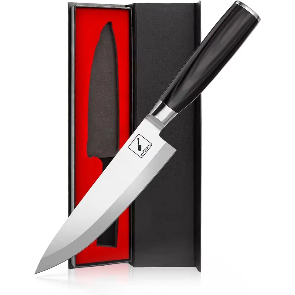 Professional Santoku Knife: This imarku Super Sharp Santoku Knife is made of German HC stainless steel that resists rust, corrosion, and discoloration. It can be used for your daily kitchen tasks of chopping, slicing, dicing, and mincing of all kinds of meat, vegetables, fruits, and bread. It is suitable for both home and restaurant kitchens Ultra-Sharp Edge:This kitchen knife is very sharp and has undergone many rigorous tests. It will be perfect for both home and professional kitchens. The thickness of this kitchen knife is 2.5mm. Its hand-polished edge is 15-18 degrees per side, which is sturdy and sharp to get the job done perfectly Ergonomic Design:The handle of this Santoku knife is blue and ergonomically designed. The Parkwood handle makes it very easy to cut with this knife. The ergonomic handle reduces the pressure on the grip, so you won't feel your wrist getting tired even after long hours of use. This Santoku knife is perfect for housewives, cooking enthusiasts, and professional chefs Unique Blade Design:This 7" Santoku chef's knife is designed with a unique hollow oval edge on both sides of the blade. This unique design prevents vegetables and meat from sticking to the blade when using this knife to cut vegetables or meat. This Santoku chefs knife will give you a great experience when slicing, dicing, and chopping Guarantee&Exquisite Gifts:We have a perfect after-sales service system to provide you with satisfactory service. This knife comes in a very nice package, perfect for birthday gift, Christmas gift, Thanksgiving gift, etc