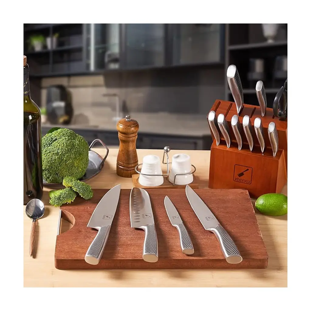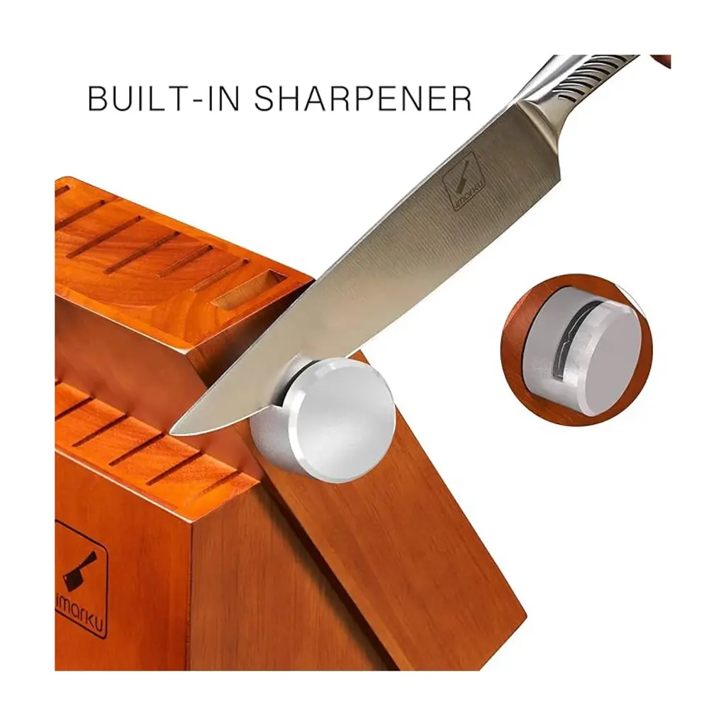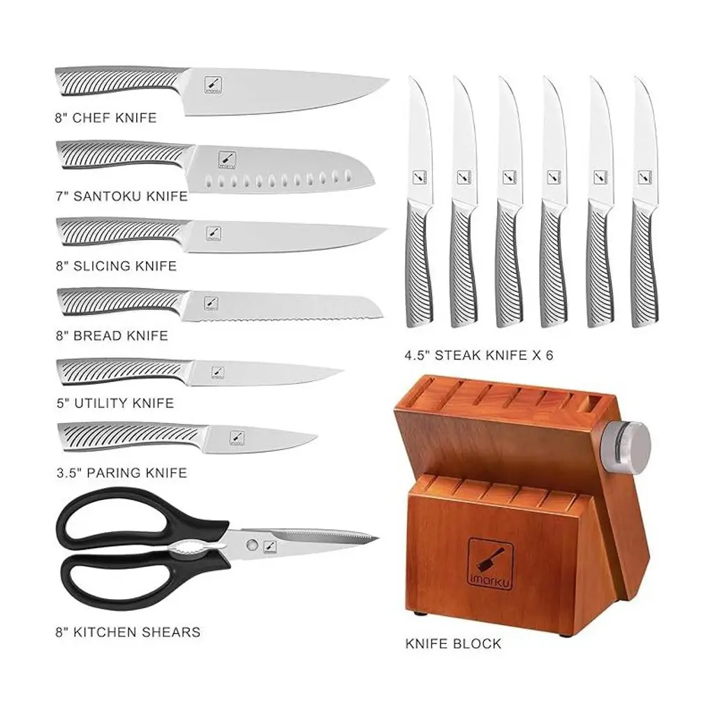 Premium Knife Set with Block: The ultra-sharp kitchen knife sets adopt high-quality stainless steel, hand sharpened to an 18¡ãdegree angle per side, maintaining the perfect balance between blade sharpness and maximum resilience. The knife block is made of sturdy and durable solid wood, ventilation design at the bottom, and the wood grain is clear and beautiful High-quality Kitchen Knife Set: Each knife blade in this chef knife block set is made of premium imported steel from Japan, safe for dishwasher. All the knives are precisely processed heat treatment ensuring every blade maintains its strength and function. Rockwell hardness reaches 56 ¡À 2 HRC Most Comfortable Kitchen Knives: Full tang ergonomic handle provide a comfortable and flexible grip. Increased handle weight improving balance. The design of the handle uses special technology to form ridges that not only increase aesthetics but also offer better grip Value Knife Set: 14-piece knives set for kitchen includes 8" chef knife, 7" Santoku knife, 8" bread knife, 8" slicing knife, 3.5"paring knife, 5" utility knife, 4.5" serrated steak knife * 6, kitchen shears and knife block. All-in-one knife sets for kitchen with block meets all kinds of needs of your kitchen Trustworthy: Designed in California, imarku focuses on developing high-quality knives and is dedicated to enhancing your cooking experience. We promise to cover our knife sets for life. If knives set is defective, we will provide a free exchange or return for life. imarku knife set for kitchen with block is the perfect Father's Day gift for dad, also for Weddings and Housewarming