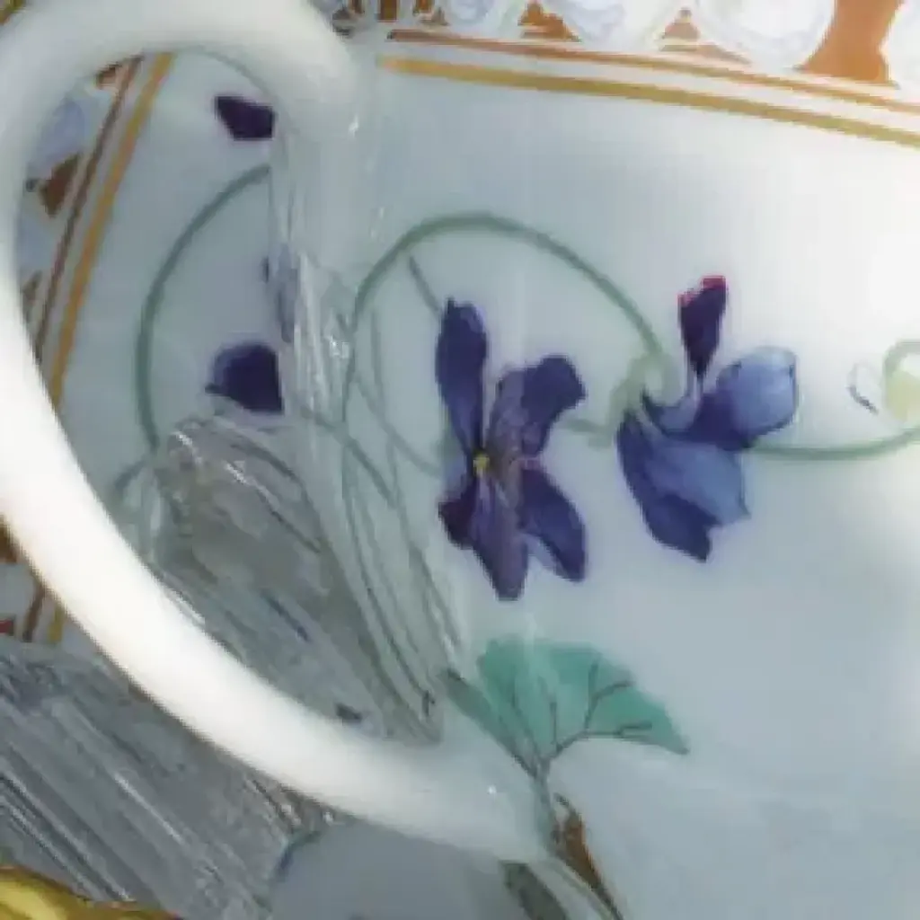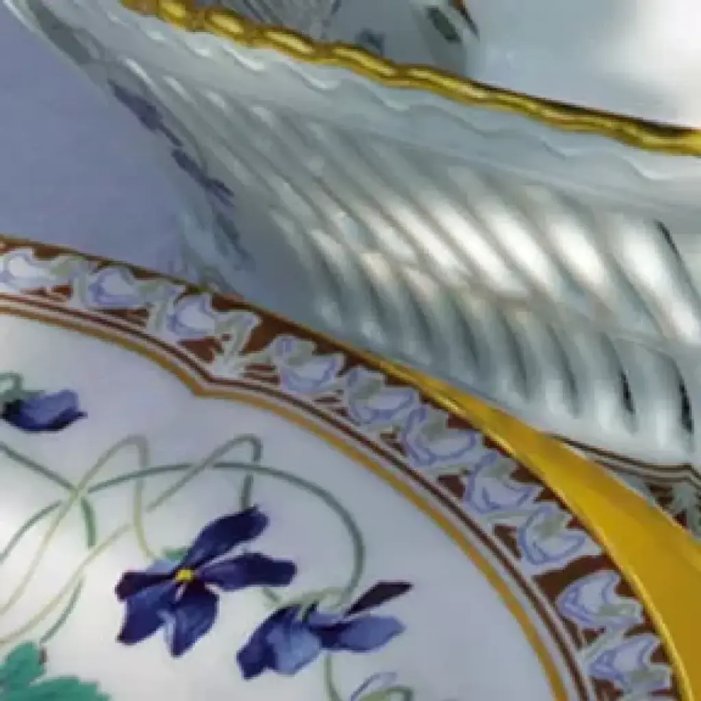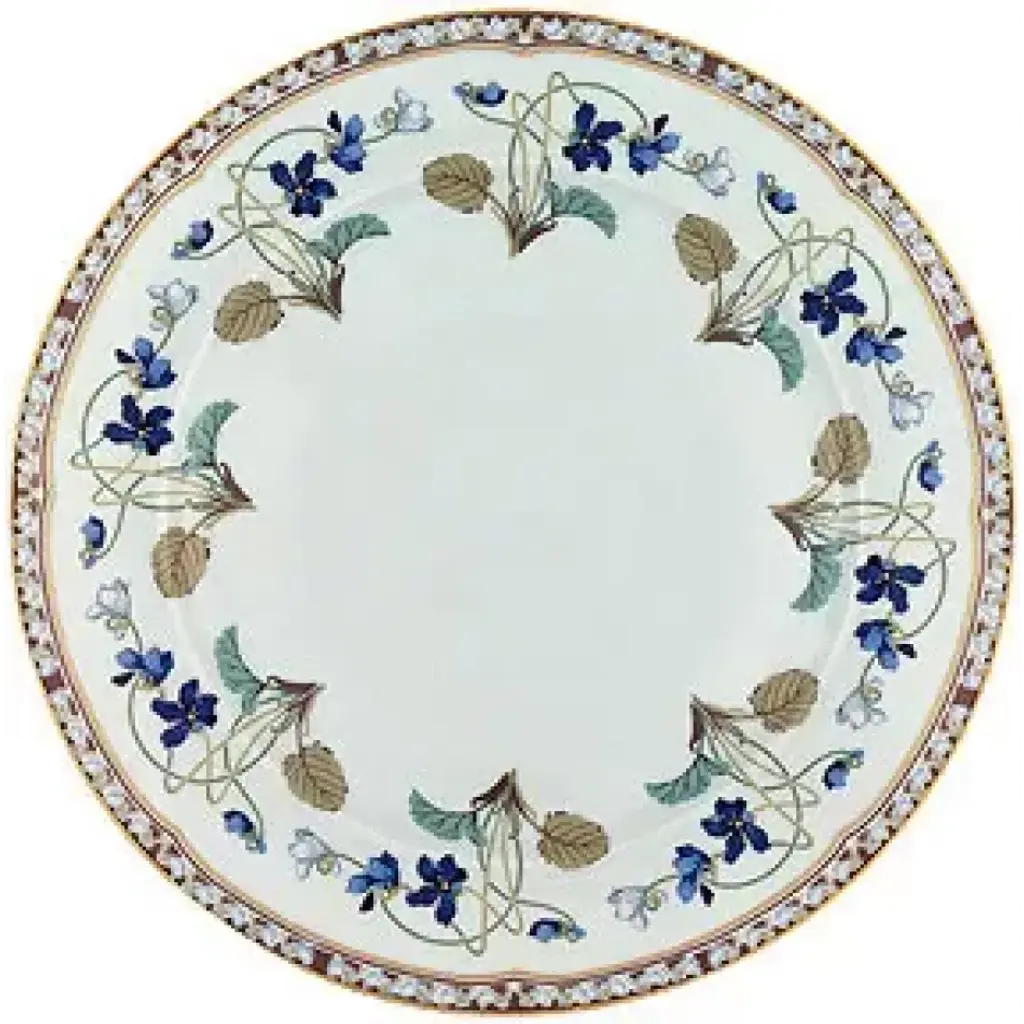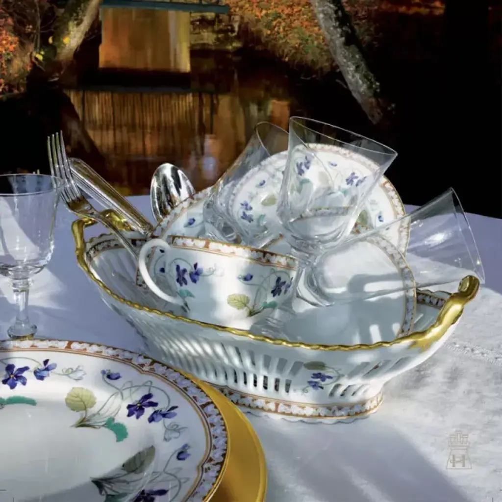 Haviland's Imperatrice Eugenie dinnerware is based on a pattern created for the Empress Eugenie of France, who helped create the Napoleon III style. The original pattern is on display in the Haviland Porcelain Museum in Limoges. Each piece is decorated with violets, a symbol of modesty, and edged with gold. Five piece place setting includes dinner plate, salad/dessert plate, bread & butter plate, teacup and saucer. Haviland Porcelain was founded by David Haviland, an American who moved from New York to France after he was brought a broken tea cup to match and recognized the quality and color of the old piece of porcelain. Filled with curiosity, he went to France to find the factory where the cup had been made, but the samples he was sent were not up to his standards. So in 1841, he moved to Limoges to set up his own factory. Traditional French dinnerware was usually produced in Limoges and sent to Paris for decoration. Haviland insisted on setting up a studio within his factory to have more control over the designs. Renowned artists, including Cocteau, Dali, and Kandinsky have played a role in the company's designs. Today, Haviland is one of the premier names in French porcelain dinnerware, sought by collectors all over the world. Clients have included the White House, Empress Eugenie, General de Gaulle, Jacques Chirac, the Emperor of Japan, and the Royal Court of Morocco.