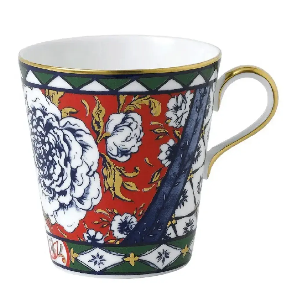 The mug of this pattern has a simple shape but is very decorative. A favorite with brides, Mottahedeh specializes in luxurious patterns and unique, elegant shapes that are reproduced from china found in museums and historical societies. The patterns feature complex and vibrant colors, and hand-painted gold decoration. The pieces are surprisingly fresh and timely, and look wonderful in both contemporary and traditional dining rooms.