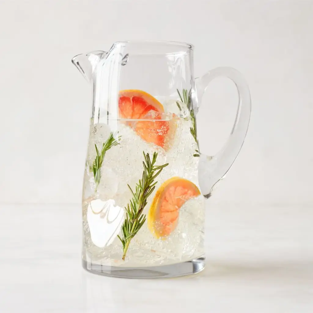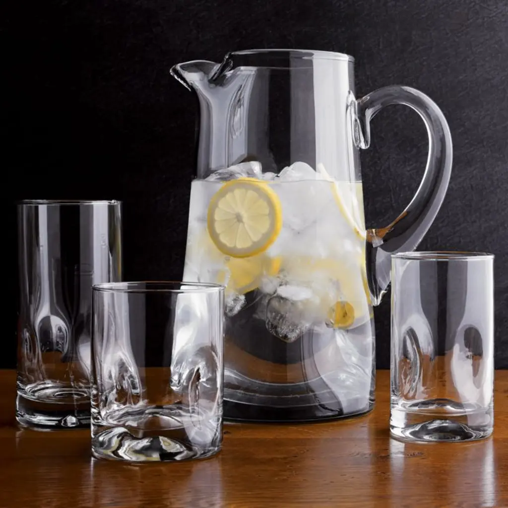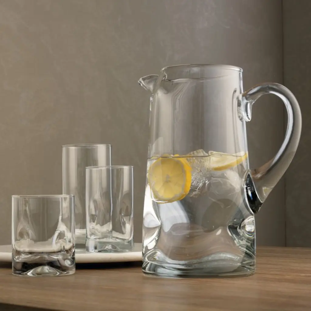 Serve lemonade, iced tea and cocktails in style with our striking pitcher. A clean shape with four distinctive impressions and a thick sham tapers slightly at the top. The four dimples are made by hand for a unique look, while the gracefully arched handle gives you a comfortable hold on the drink pitcher. For a unified drink service, pair the glass pitcher with the coordinating Impressions juice and cocktail glasses.