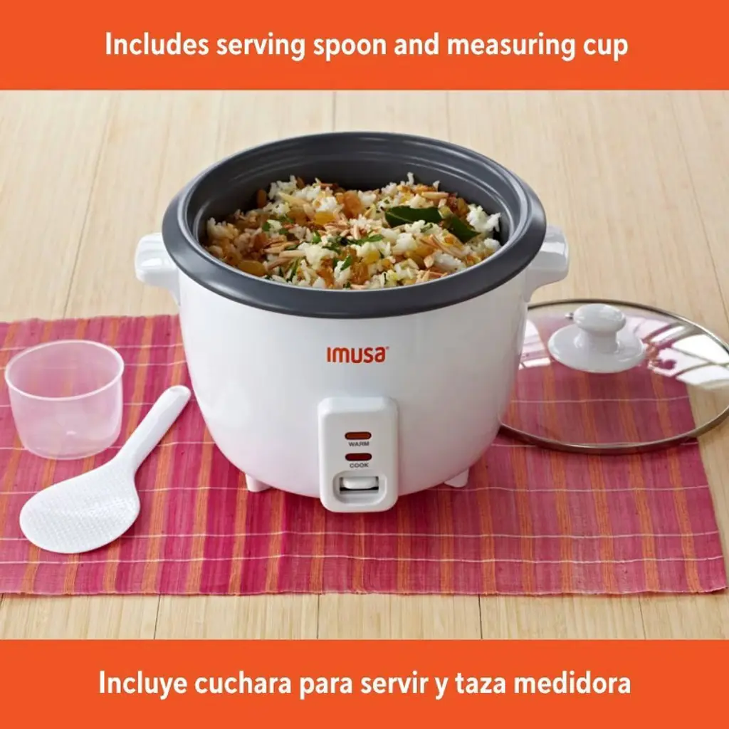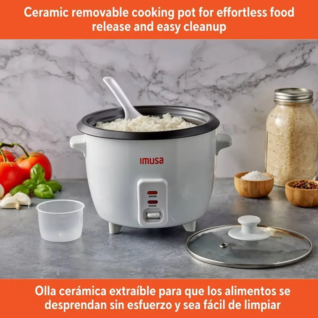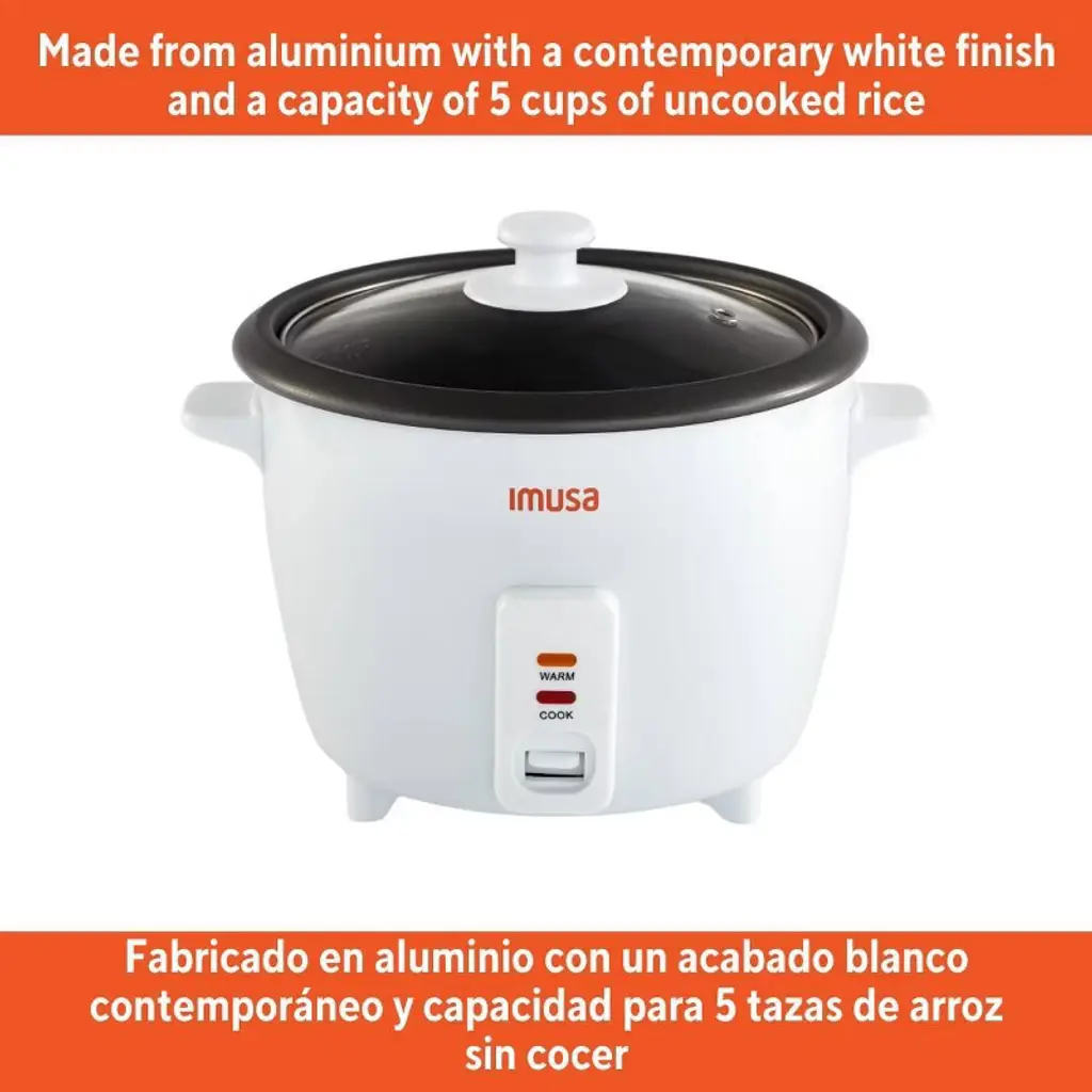 The IMUSA 5 Cup Electric Rice Cooker will make the perfect rice dish at the flip of a switch. This rice cooker is made of aluminum with a bright and modern white exterior finish that makes it the perfect fit for any kitchen. The IMUSA Rice Cooker has a capacity for 5 cups of uncooked rice. Cleaning the IMUSA Rice Cooker is easy with the removable Ceramic nonstick pot which prevents your rice and other foods from sticking, and its included serving spoon and measuring cup are the perfect complimentary tools for easy cooking. This rice cooker has cool touch side handles and knob enabling easy operation and transport, and its transparent lid allows you to monitor food while it's cooking. The "warm" feature of the IMUSA Rice Cooker keeps your foods at perfect serving temperature once the cooking cycle is completed, so you´ll always be able to enjoy delicious and warm meals. Use this rice cooker to prepare delicious rice, oatmeal, stews, quinoa, grains, and more. Whether you use it for a small kitchen, college dorm life, and camper and RV traveling, the IMUSA Rice Cooker excels. Trust the IMUSA Rice Cooker as your go-to kitchen helper. It will surely become your kitchen's beloved companion simplifying and enhancing your culinary endeavors.