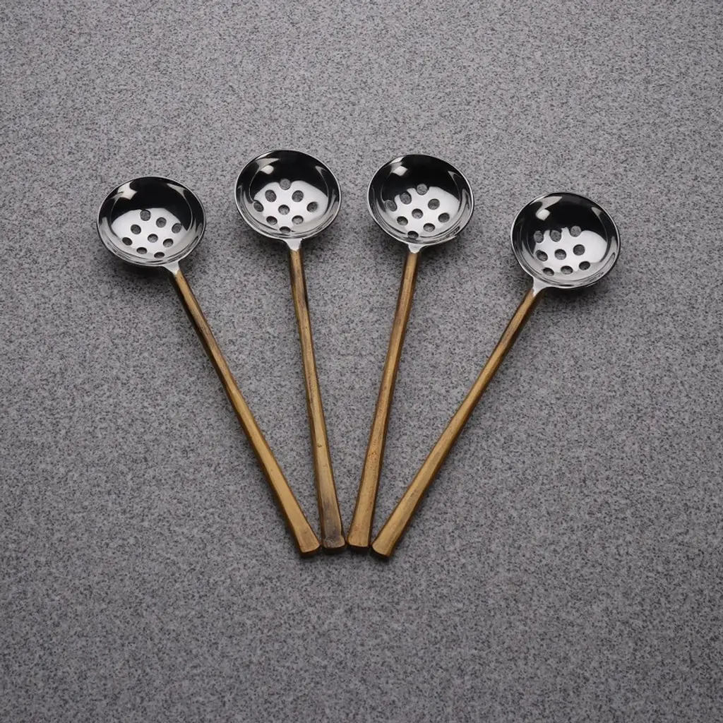Our Medicki Vintage Gold Olive Spoon 4 Pc. Set is perfect for the home bar and will be a handy accessory for your cheese boards and pickle platters. The perforated spoon lets you scoop and strain olives, capers, or cherries for cocktails and the elegantly beveled handles fit perfectly in your hand. Beyond olives, this versatile olive spoon set can also be used for a variety of other tasks. Use them to serve pickles, capers, or even small fruits with ease. Whether you're preparing cocktails, and tapas or setting up a charcuterie board, these olive spoons will become an indispensable part of your bar or kitchen accessories. Artisan-crafted olive spoons add a distinctive look to your home bar.