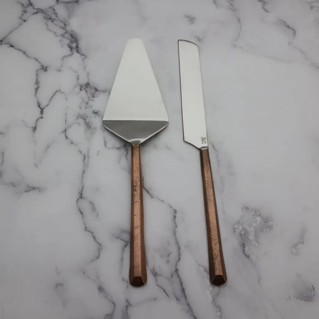 The Plateau Cake and Pie Server Set will add charm to your dessert table. Handcrafted for cutting and serving cakes and pies, the design features square beveled edge handles with a highly polished knife and server. Designed to make your cake-cutting experience a breeze, the Plateau cake serving pieces are ideal for birthdays, weddings, anniversaries, and many more occasions. The elegant artisan design of this set enhances the visual appeal of your cake, making every celebration that much more memorable. Impress your wedding guests with the Plateau cake-cutting set.