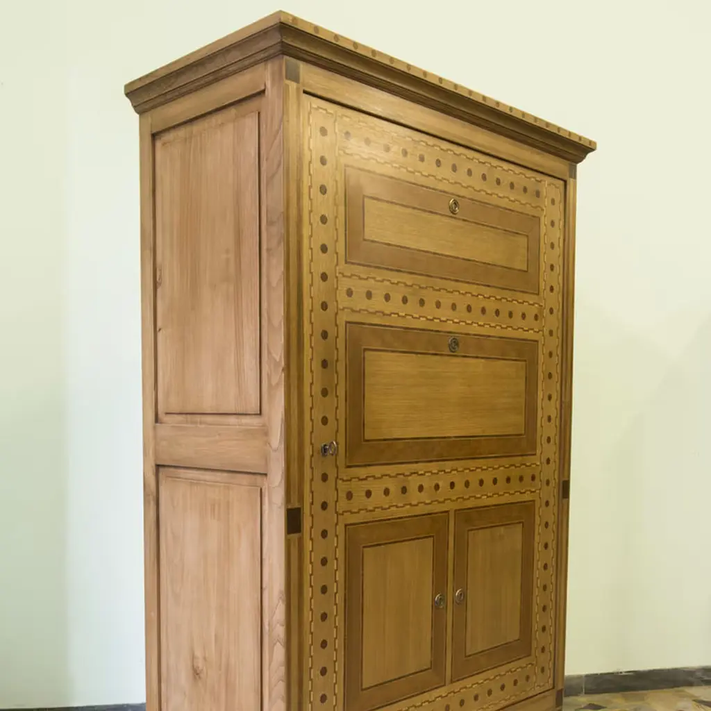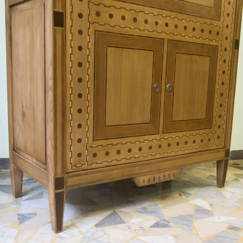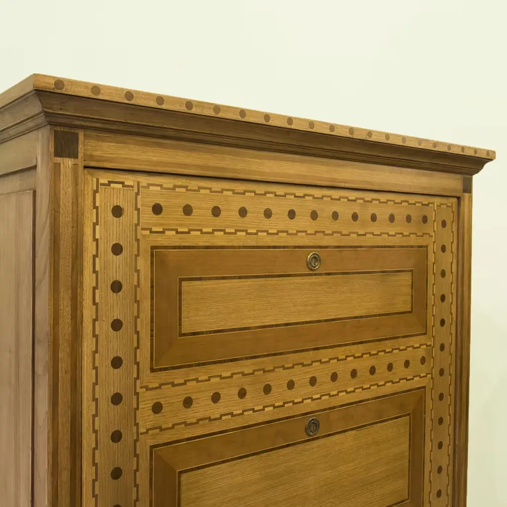 Nothing short of impeccable quality, this cupboard features a tall structure entirely handcrafted of chestnut wood supported by pyramidal feet. The most distinctive feature of this remarkable piece is the skillfully inlaid work in caramel and chocolate brown hues that creates the optical effect of two flap doors on top and two front-opening doors at the bottom but it is in fact a single door. Framed by an elegant geometric border, the door opens to reveal an attractive dark stained interior with two shelves. This cabinet ships fully assembled.