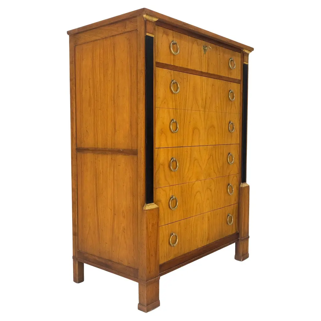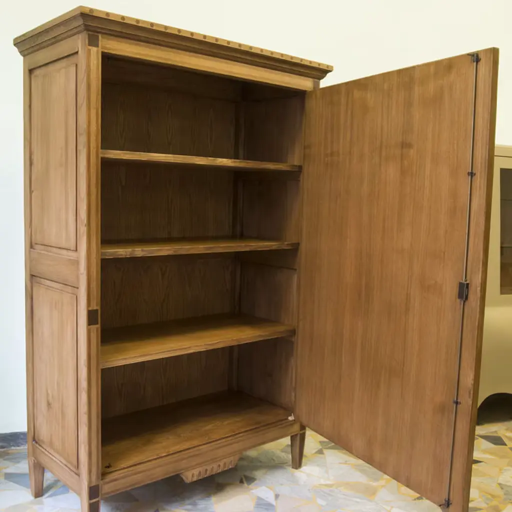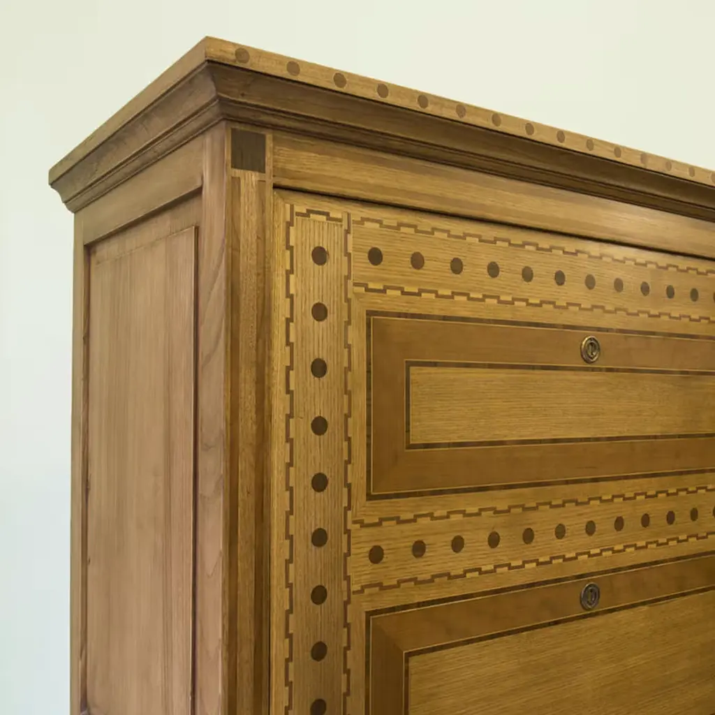 Nothing short of impeccable quality, this cupboard features a tall structure entirely handcrafted of chestnut wood supported by pyramidal feet. The most distinctive feature of this remarkable piece is the skillfully inlaid work in caramel and chocolate brown hues that creates the optical effect of two flap doors on top and two front-opening doors at the bottom but it is in fact a single door. Framed by an elegant geometric border, the door opens to reveal an attractive dark stained interior with two shelves. This cabinet ships fully assembled.