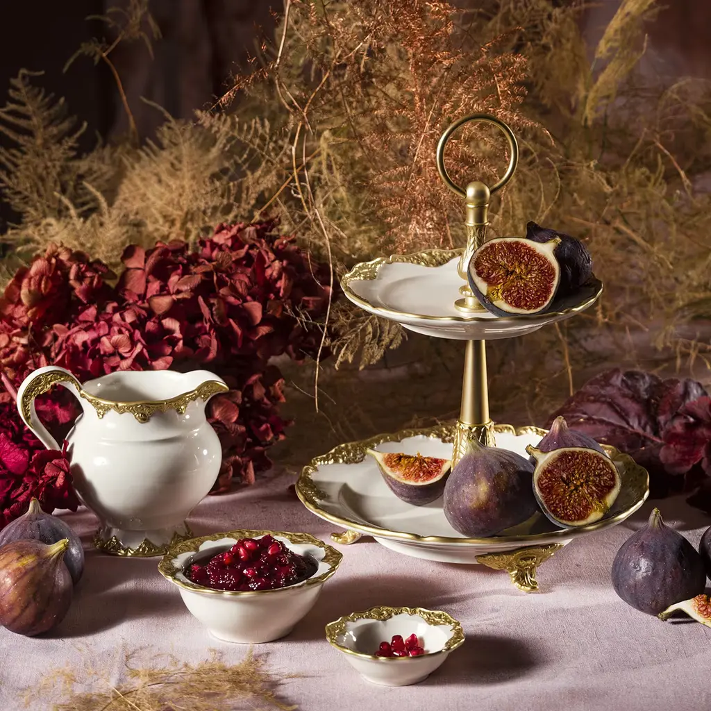 A superb solution for complementing elegant breakfast tables, this classic milk jug is a precious porcelain design of rare class. Raised decorations accented with pure gold adorn both its lower and upper hedges, also extending to the sinuous handle's top. Please explore all the designs from the Irene Collection in the Artemest catalog for luxurious coordinated arrangements.