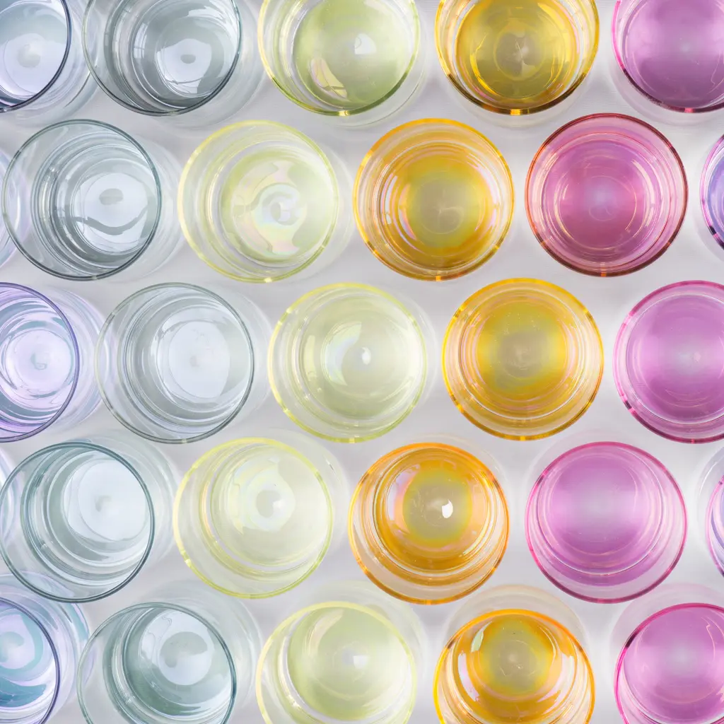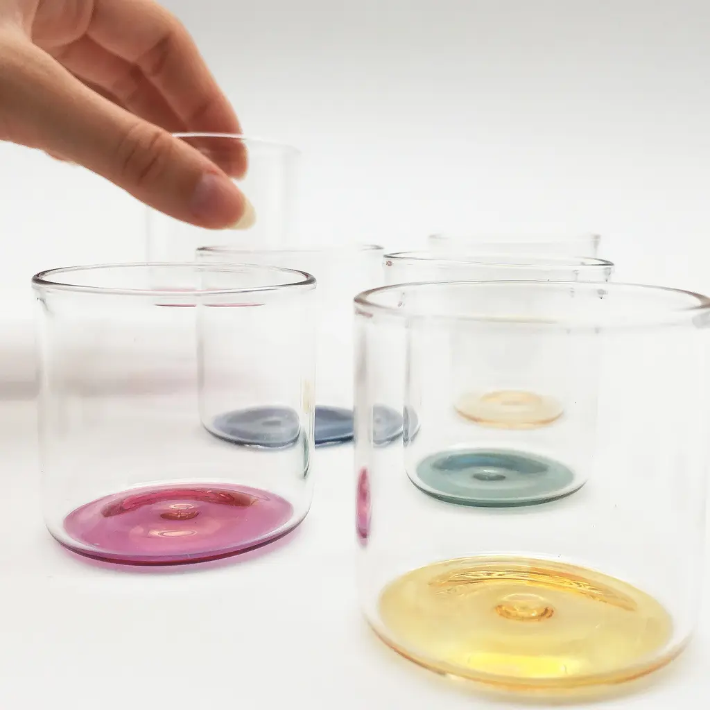 The ‘Iride’ collection utilizes light refraction to bring the background color to the forefront, turning the table into a vivid palette. Each piece is handmade, featuring a hand-painted background, which creates a unique interaction with light and color. The transparency of each element adds to the distinctiveness of the collection, making every item truly one of a kind.