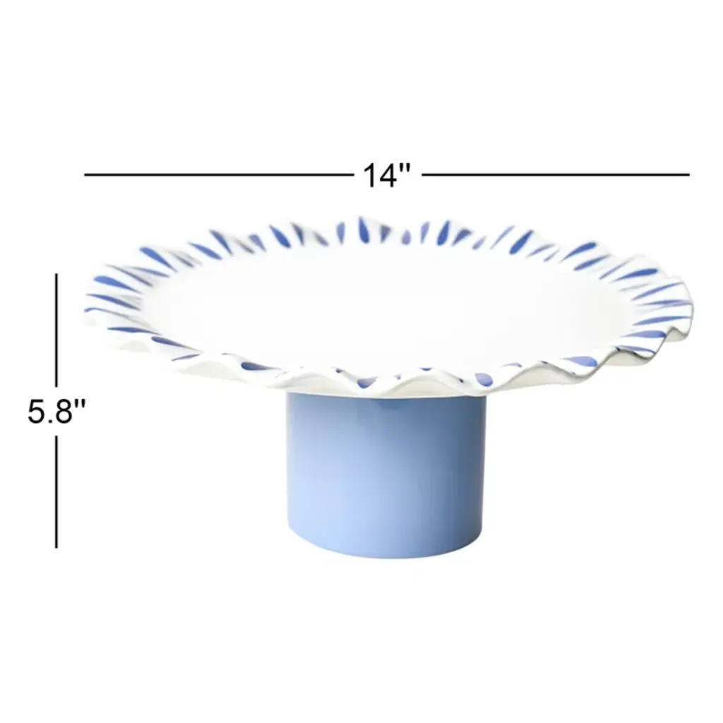 Our Iris Blue drop ruffle 14” cake stand features our signature ruffle edge with a repeated elongated drop shape in deep Iris Blue. Display your baked goods or present a celebratory cake in style.