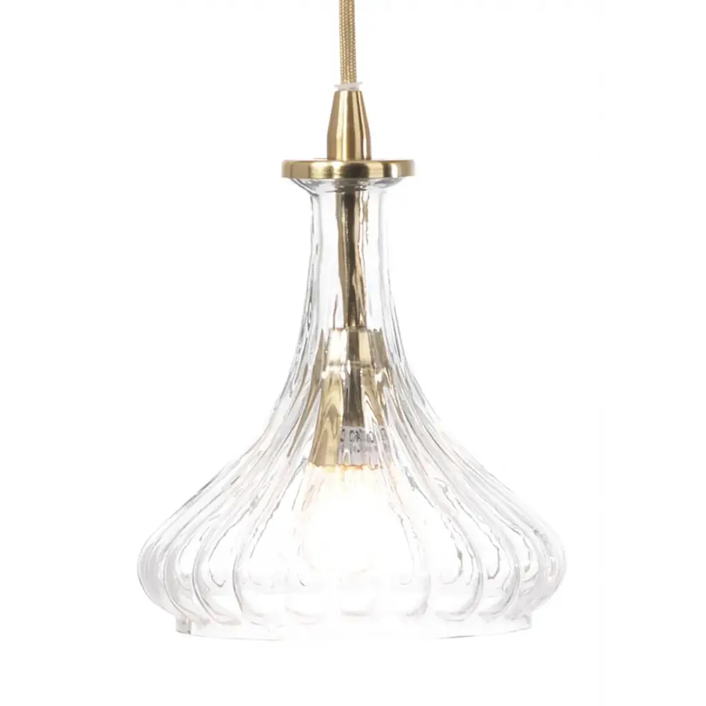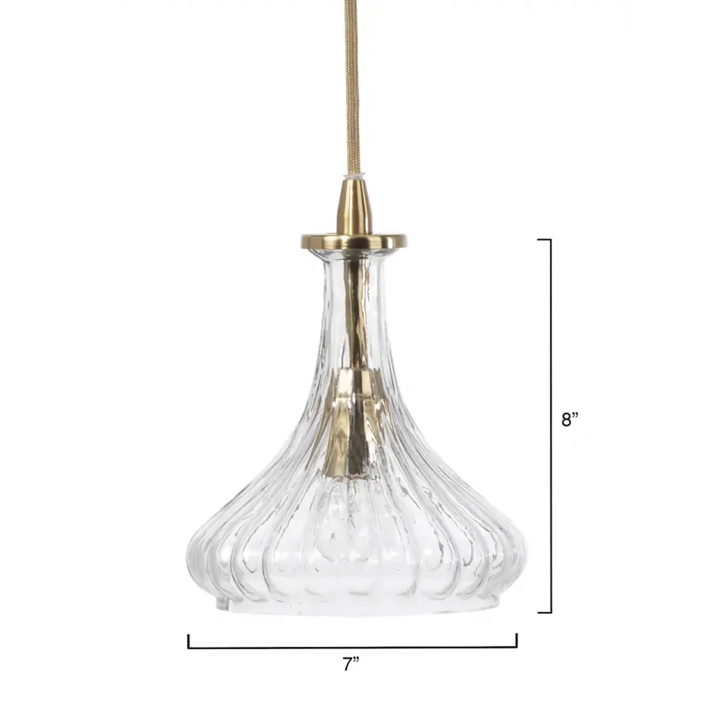 Inspired by the charming lines of a carafe, this pendant delivers a vintage flair to any entryway, kitchen, or bar area. Made of hand-blown glass, the shade features ribbed detailing that beautifully reflects the light within. Accented with antique brass hardware and cord for a glamorous feel. Rich in texture and dimension, you can arrange them singly or in group to create a flickering composition of light.