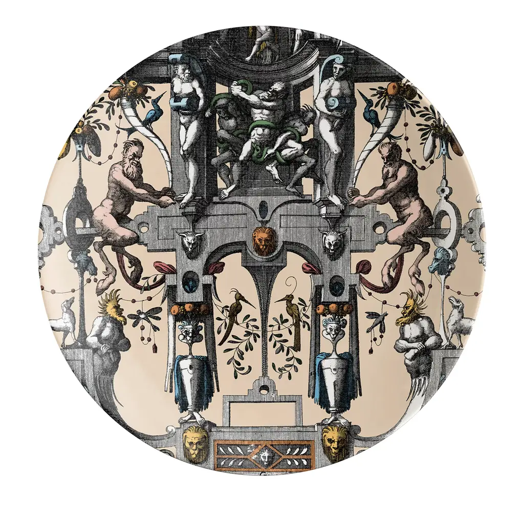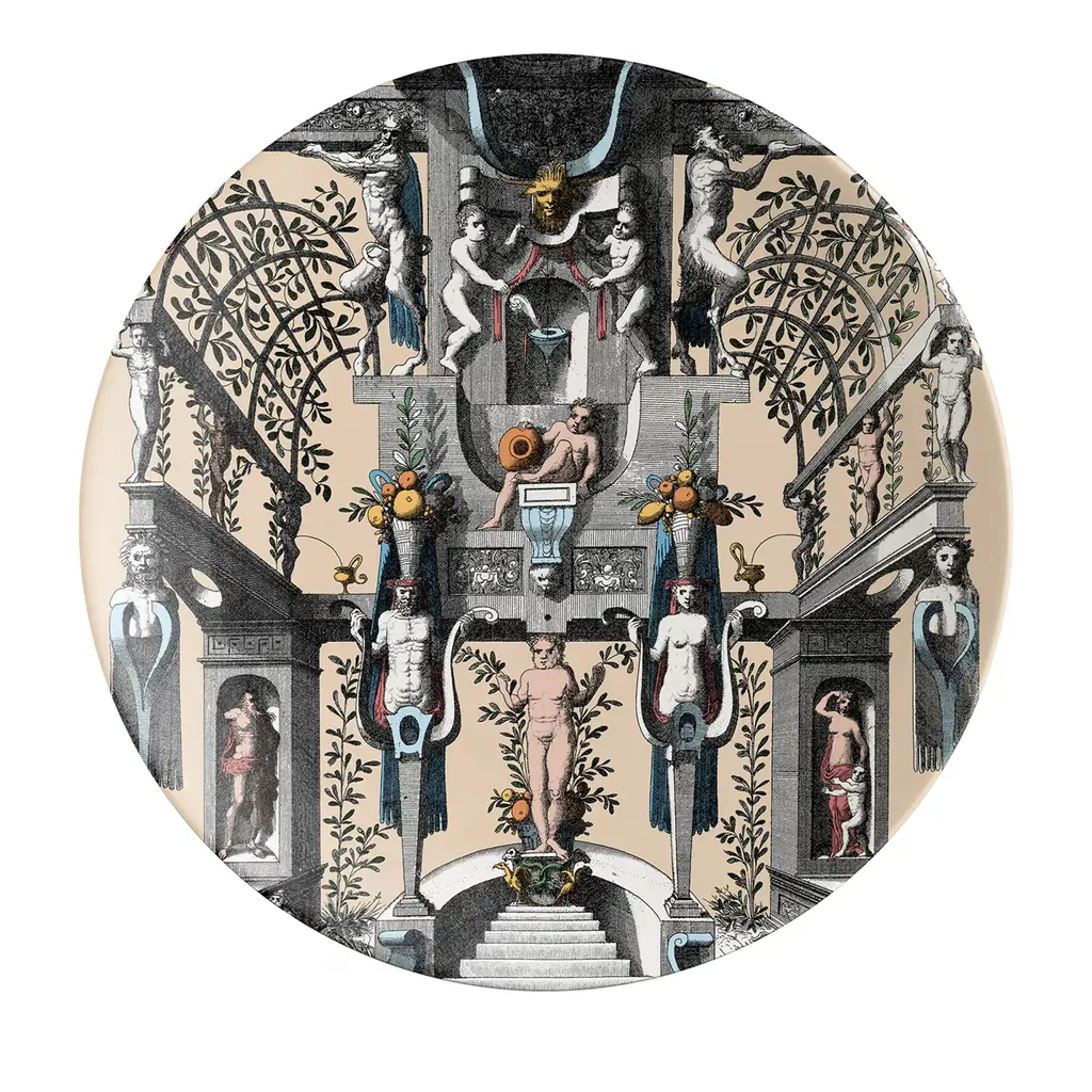 Elegantly floating on a bed of flowers, the stunning woman protagonist of this decorative wall plate is one of Le Mie Donne collection (My Women). This series of plates and bowls was designed in 1925 by legendary artist Gio Ponti, as the first of its creations for Richard Ginori, when he was the artistic director of the brand. This plate combines classical elements, visible in the repetition of obelisk-shaped decorations around the rim, and a sublime Art Deco style that incorporates Surrealist traits in the perspective and in the town depicted at the bottom.