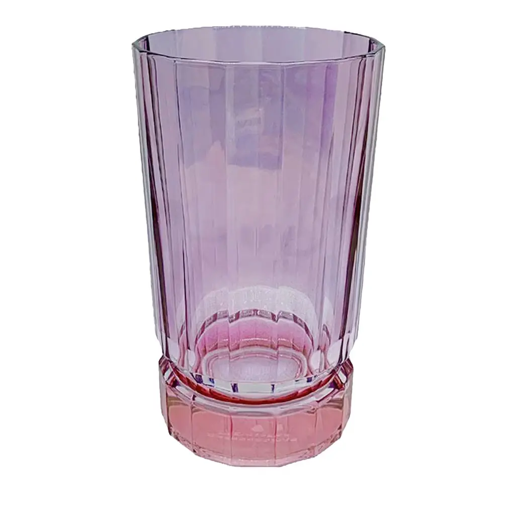This stunning set of two V-shaped water glasses flaunts a sophisticated design, defined by a textured surface of vertical grooves creating a dynamic effect. This set is handcrafted of high-quality glass in an enchanting tone of purple, imbuing each piece with an enchanting allure.\n