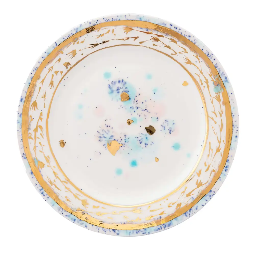 The Islamorada Dinner Plate from the Florida collection, launched in 2023, beautifully captures the essence of luxury and cheer. Inspired by Florida's vibrant character, these plates feature a soft Islamorada lavender that evokes the tranquility of its sunsets and serene beaches. It is adorned with a lightly colored center, playfully sprinkled with multicolor dots, adding a whimsical touch. The elegantly finished rim, richly decorated with golden leaves, enhances their sophication.